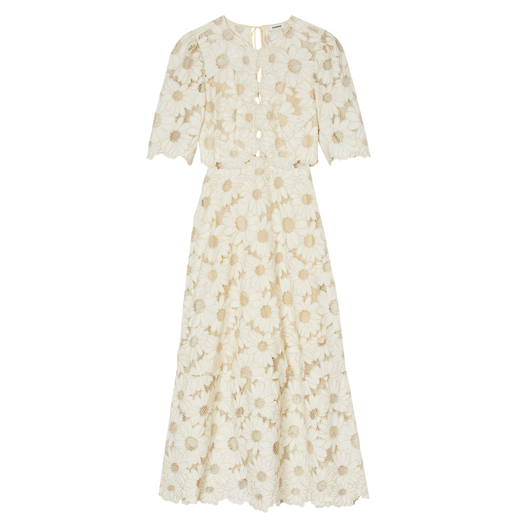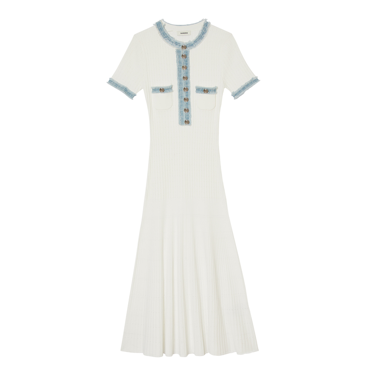 Sandro 這季的重點著重在異材質與不同元素的拼接,以修身又顯瘦的白色為基底,加上牛仔布料點綴領口、袖口與口袋,讓你甜美之餘又帶有一絲個性,印有 S logo 的銀色鈕扣更為洋裝添增份量感,就算單穿也能很有型。