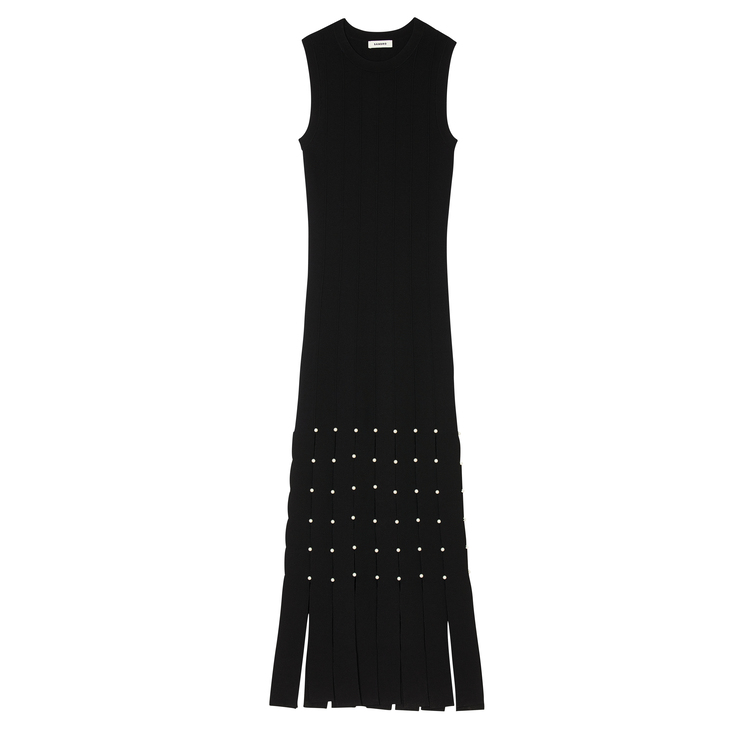 熱愛黑色系的酷女孩同樣能在這季的 Sandro 挖到寶!黑色珍珠流蘇長洋裝同樣以針織加上貼身設計讓你穿上身就達到濾鏡般的顯瘦效果,裙中的珍珠加上裙擺的流蘇設計更添增了一絲個性,不論想單穿、搭配西裝外套或穿毛衣露出下擺都能達到截然不同的時髦效果。