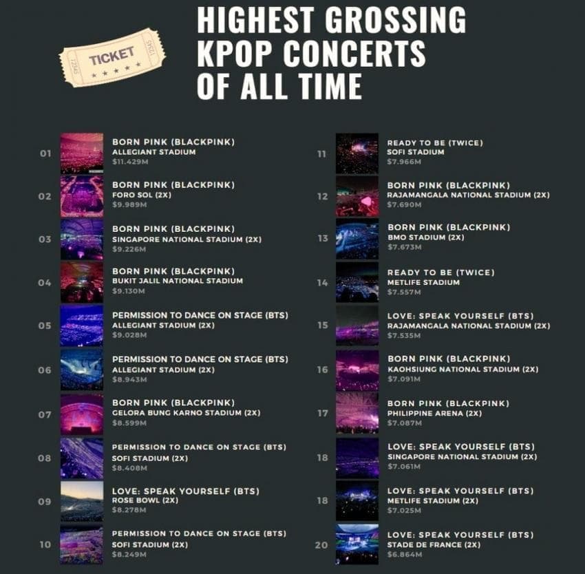 儘管目前BTS所有成員都在服役中,也沒有後人可以趕上他們創下的斷層成績,統計包含疫情期間的演唱會票房在當今韓國男團中仍舊是一騎絕塵!尤其2022年在拉斯維加斯的「BTS PERMISSION TO DANCE ON STAGE」巡迴演唱會成績更是驚人,連續四天的演出共吸引約20萬名歌迷朝聖,單一場演唱會票房就創下900萬美金,也刷新成為自身最賣座的一場演唱會,更讓他們被韓國媒體稱目前「最會賺」的韓國歌手!