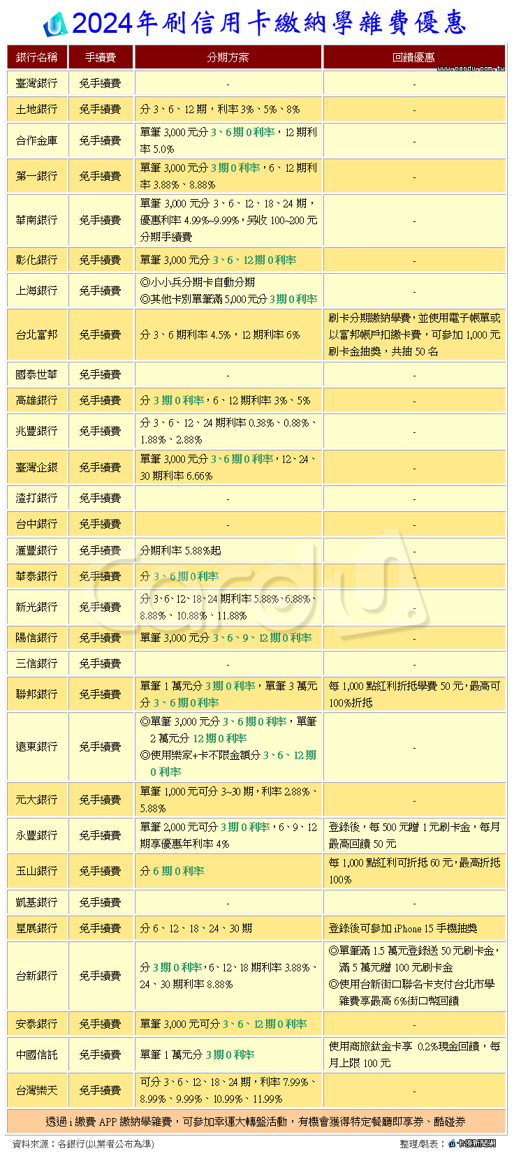 歡樂的長假過完,準備開學了,不僅要上學的孩子們覺得難過,收到學雜費繳款通知單的父母也在為自己的荷包默哀,因此挑一張最適合的信用卡,不僅有抽獎、現金回饋、紅利折抵等福利,更能分期付款減輕負擔喔!今(2024)年刷卡一次繳清,各銀行都不收手續費,有24家提供分期服務,其中15家有0利率優惠。