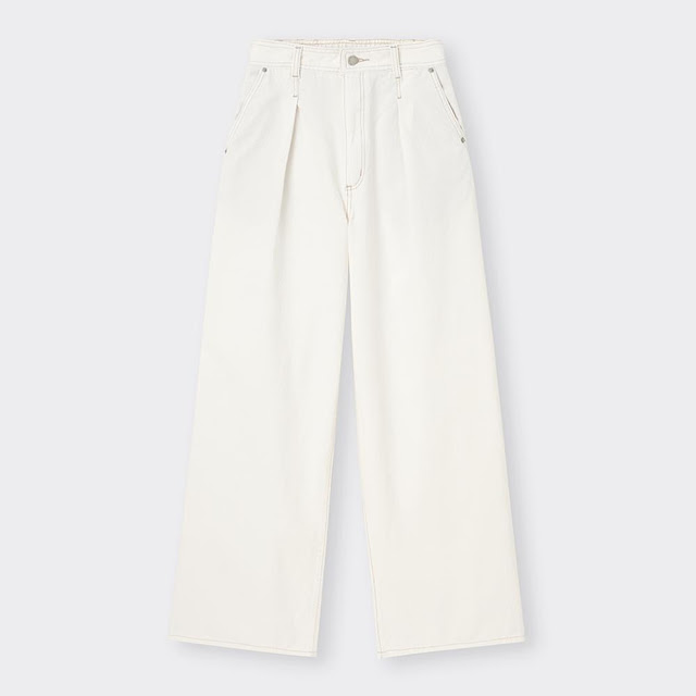 白色褲款也是這幾年非常流行的時尚單品,除了適合在春夏穿著,在秋冬季節也能為清一色的深色單品注入亮點,展現時髦氛圍。GU 推出的這款寬褲採用輕磅牛仔材質,相較於前一代商品減少了後方腰部彈性抓皺和前方打褶量,讓率性感更上一層樓!