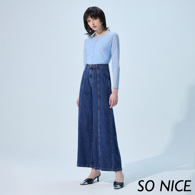 接下來介紹的這款 SO NICE 的牛仔寬褲採用了俐落的中央切線設計,不僅為原本單調的寬褲增添了設計感,也意外地有修飾腿部線條的效果!而且,它的褲管具有一定寬度,就算是大腿比較有肉的女孩也能輕鬆穿上,是小編非常推薦的一款~