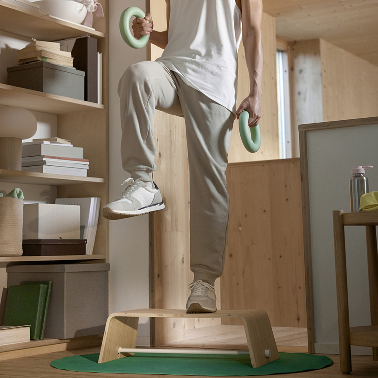 「DAJLIEN踏板」也有多功能用途,平日可放在電腦桌下,作為緩和腿部壓力的腳踏板,運動時可作為有氧階梯踏板,訓練腿部肌肉與身體平衡。另外IKEA一直熱賣的推車,在這則玩出新花招!「DAJLIEN推車」巧妙的設計方便收納運動墊、筋膜滾筒或是啞鈴等各式健身小物,輕巧的車身可輕易推進餐桌、書桌下方。運動衣物及毛巾則可以掛在時尚的「DAJLIEN衣帽架」,清新色彩和簡約線條的設計,適合擺放在家中任一個角落,圓環頂端設有防滑裝置,一次掛上四件衣物都不怕滑落。