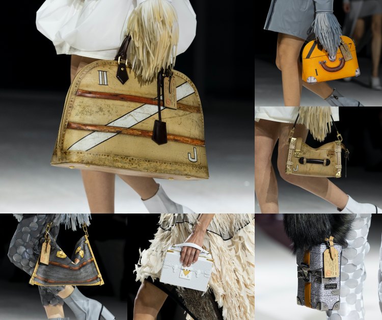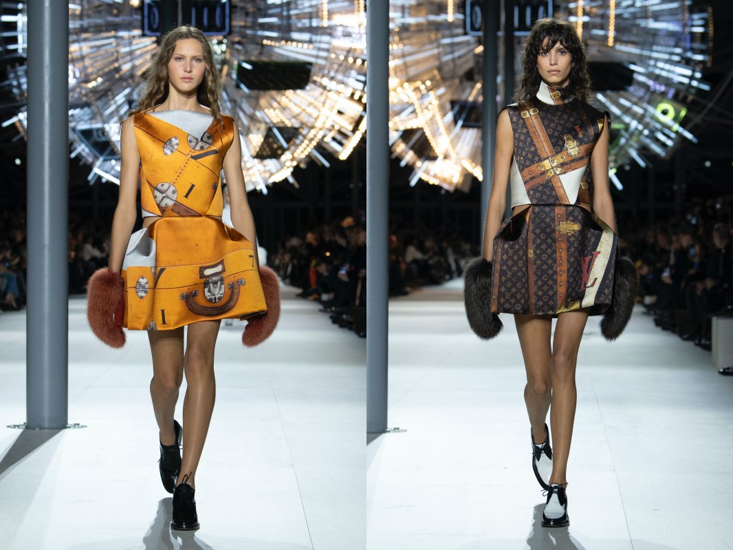 以訂製硬殼行李箱起家的 Louis Vuitton,Nicolas Ghesquière 亦運用奇趣的印花致敬品牌的經典,例如 look8 及 look15,皆能看見訂製箱款的圖樣呈現其中,除此之外,在許多提包上也能看見設計師巧妙地將古董行李箱的圖樣印製其中。