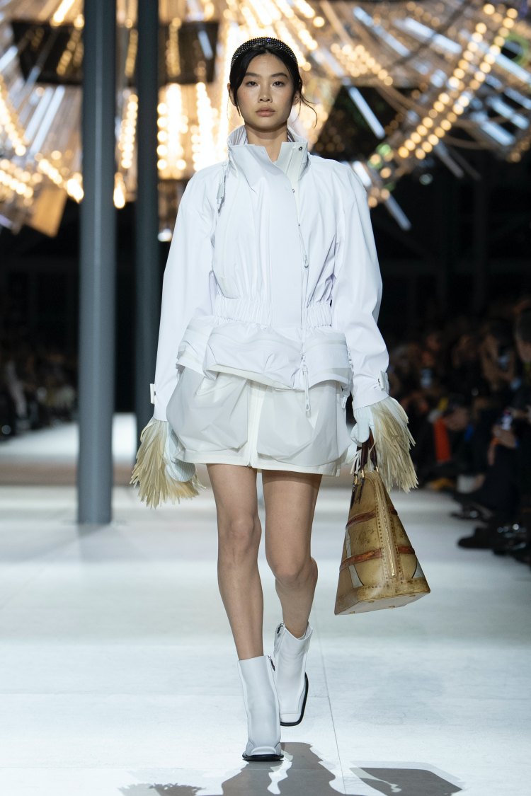 品牌大使鄭秀妍開場,科技面料的外套,搭配上羽毛的袖口手套,抓皺的收腰設計宛如裙撐,帶有外來都會的風格,與典雅的細膩剪裁,Nicolas Ghesquière 再次帶領觀眾穿越古今,以他標誌性的設計風格開啟了整場大秀。