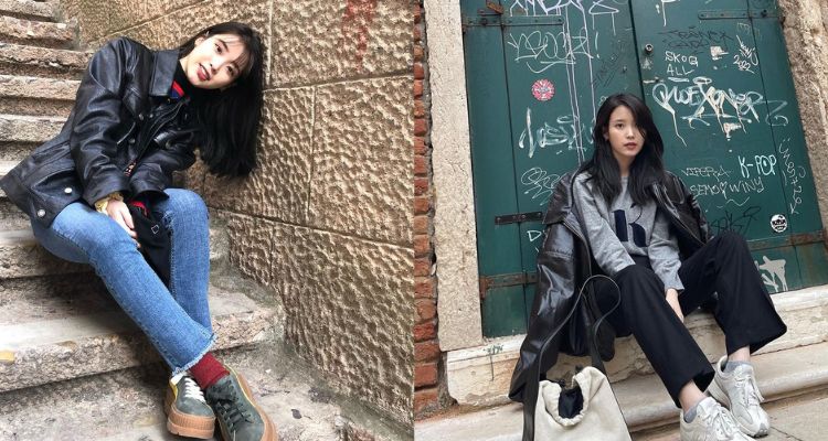 另一個常出現的就是「皮衣外套」,皮衣外套會給人較為中性的印象,但只要稍微搭配內搭及下身變化一下就可以營造可鹽可甜的風格。IU一套以紅色單品點綴,搭配藍色牛仔褲,讓整體造型更加亮眼俏皮。另一套則是黑灰色調為主,雖然較為簡約,但看起來更加率性大方。