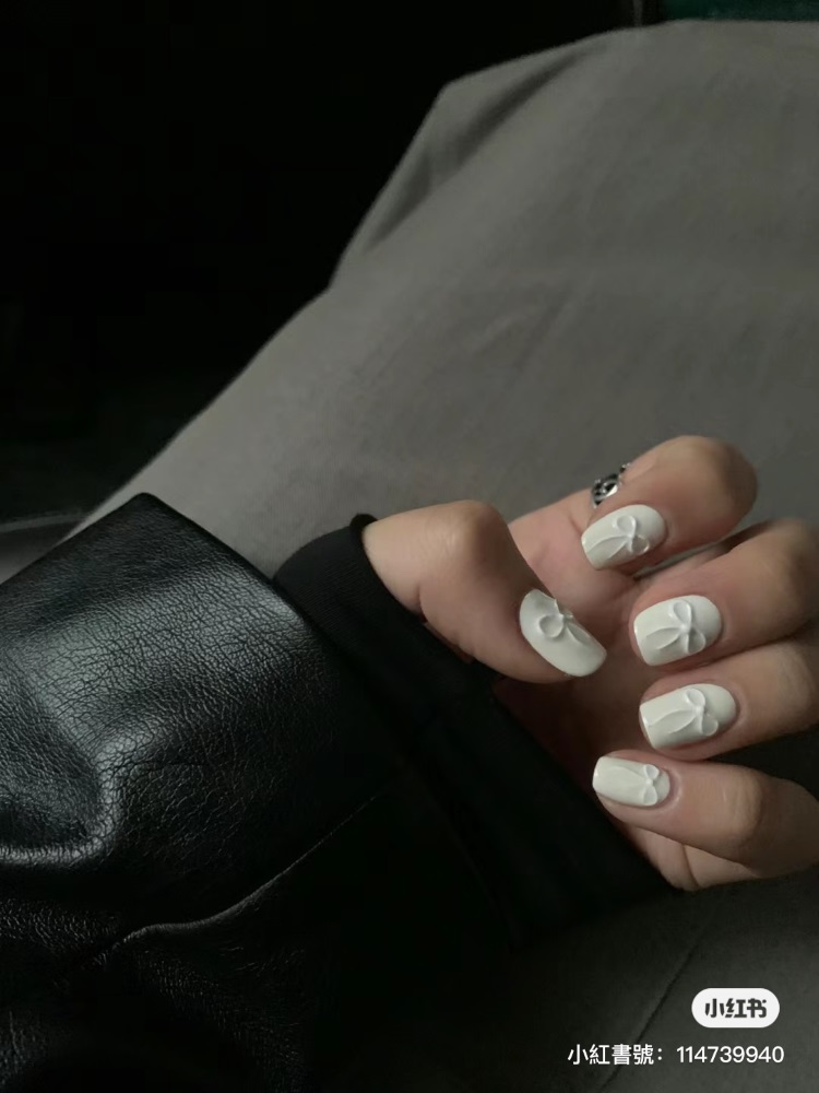 是否也有發現,近幾季蝴蝶結造型在美甲圈、時尚圈間再次竄紅,而除了帶點Y2K的彩漾色系款式之外,氣質小姊姊也很推薦試試這款純白色的浮雕款!奶白色的打底搭配上好似被夾在色料中的立體線型蝴蝶結,低調、耐看四季都百搭。