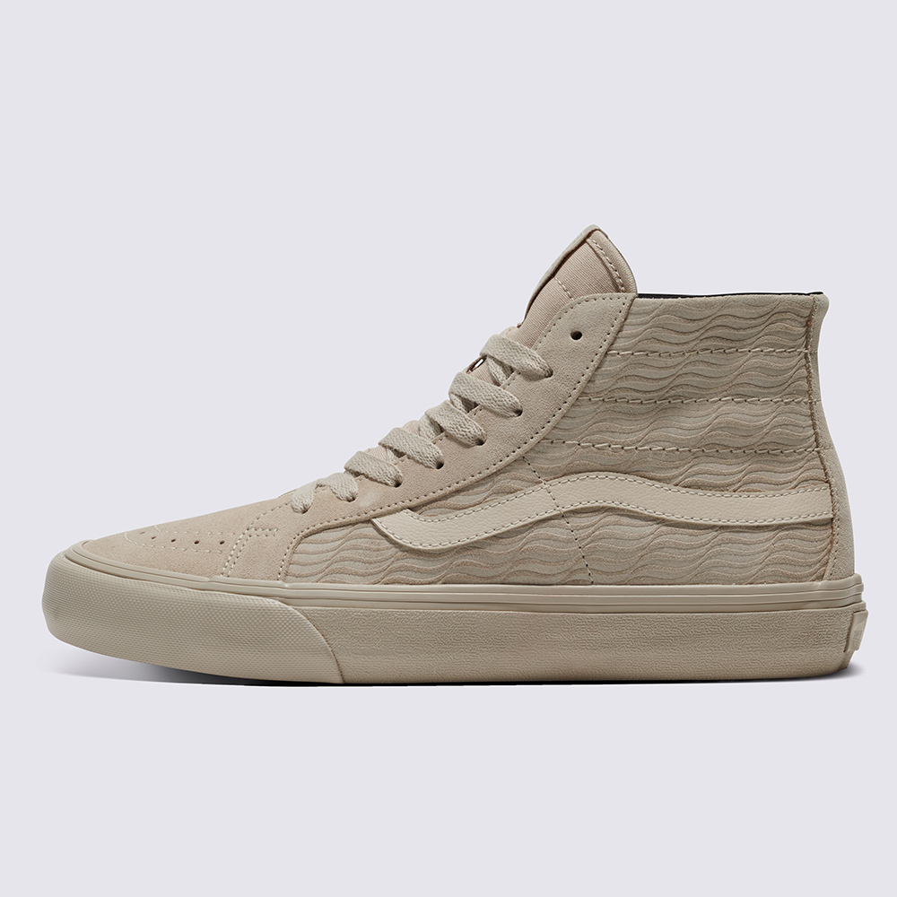 Vans x Future Currents Sk8-Hi 38 Decon VR3 SF,聯名鞋款特殊的波紋鞋面,不容易撞鞋。這雙米色滑板鞋採用麂皮材質,看上去更加復古有型。VR3舒適環保系列,鞋身輕質好穿,日常約會、工作穿著都適合。搭配韓系修身棉麻襯衫、淺色西裝褲,這樣上班穿簡單又俐落。