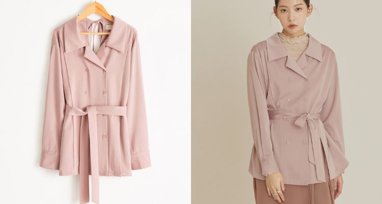 這件Mouggan的粉色襯衫將法式元素集於一身!雙排釦設計大多出現在大衣外套上,Mouggan則放在襯衫裡,加上霧面光澤面料反而展現了高級精緻感。而左前的下襬開衩和腰帶能夠提高腰線,輕易塑造出高挑比例,背部領口的綁繩細節更添雅致的溫柔魅力。