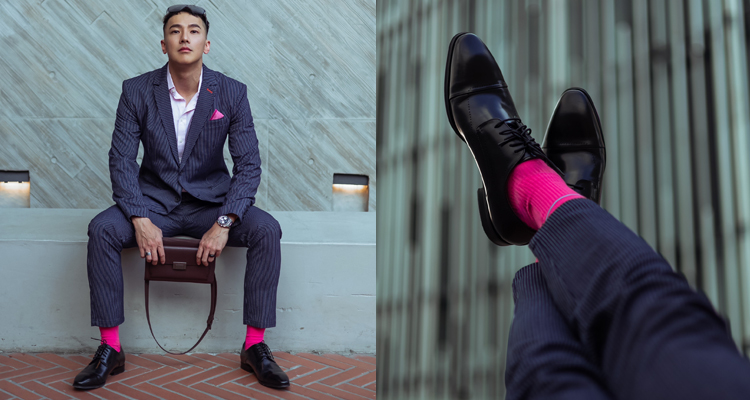 擺脫制式的西服法則,穿搭型男的劉雨凱,則為他身穿的服裝單品帶來鮮活混搭!深藍條紋西裝在繽紛粉色襯衫和襪子的搭配下相得益彰;鞋款則穿上有著以孔洞雕花細節的皮革布洛克德比鞋,內斂中帶點繽紛活力,讓個人風格更鮮明;最後,再拎上「Henry 皮革手拿包」,多夾層設計,在在都讓這款包得以兼具實用與裝飾性,展現隨興又俐落的姿態。