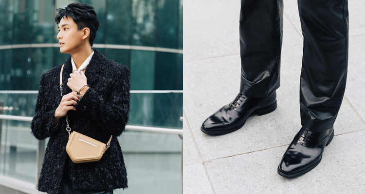 演員安俊朋,以一身修身毛呢的銀蔥西裝外套,搭配輕奢繫帶領襯衫和直筒皮褲,捎來一股華麗搖滾氛圍;而具有標誌性輪廓的卡其色「Taper 馬鞍包」則賦予安俊朋更多造型亮點;另外,所選穿的「Altitude 皮革牛津鞋」,不僅在鞋側飾以弧線增加設計細節,其拋光的小牛皮材質亦同樣呼應帶有光澤的褲裝,將時尚張力發揮的淋漓盡致。