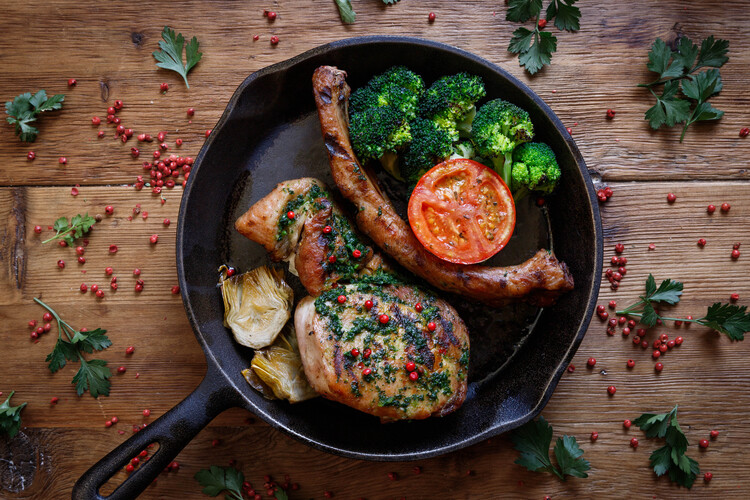 符合托斯卡尼「食豆者」的精神,不過多調味,以新鮮香草、柳橙和萊姆醃製雞肉,運用油封蒜和綜合香料一同炭烤,另外搭配蘑菇、四季豆、甜豆,不但添增視覺美感,更帶出食物原有口味。