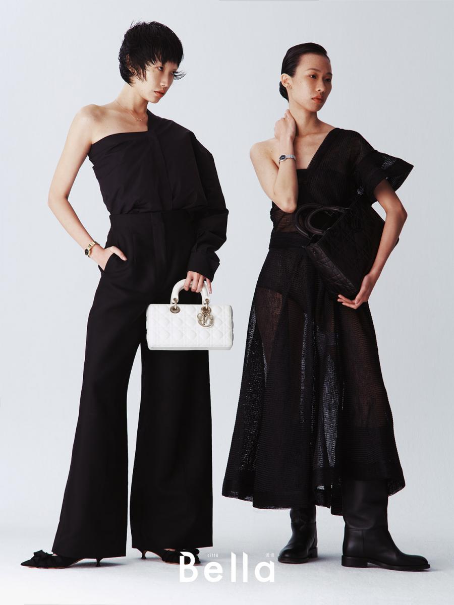 (左)黑色單肩剪裁襯衫、黑色寬管西裝褲、DIORAMOUR 黃金鑽石項鍊、白色手提包、珍珠綁帶高筒低跟鞋; (右)黑色網狀單肩設計上衣、黑色網狀長裙、黑色菱格紋手提包、黑珍珠母貝鋼織腕錶、黑色寬管短靴,all by Dior。