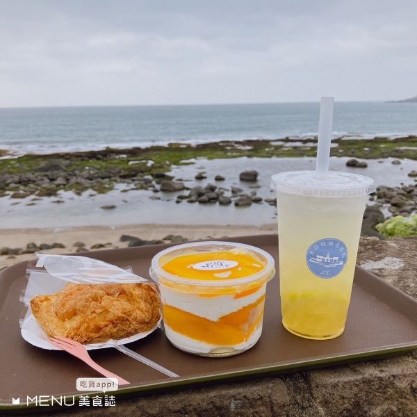 金山中角灣海水浴場旁的海上日出海洋咖啡,餐廳位在一棟老宅建築的四樓,樓頂有絕美玻璃屋,推薦檸檬香柚茶、日出氣泡飲、千層蛋糕、甜甜圈和水果鬆餅。