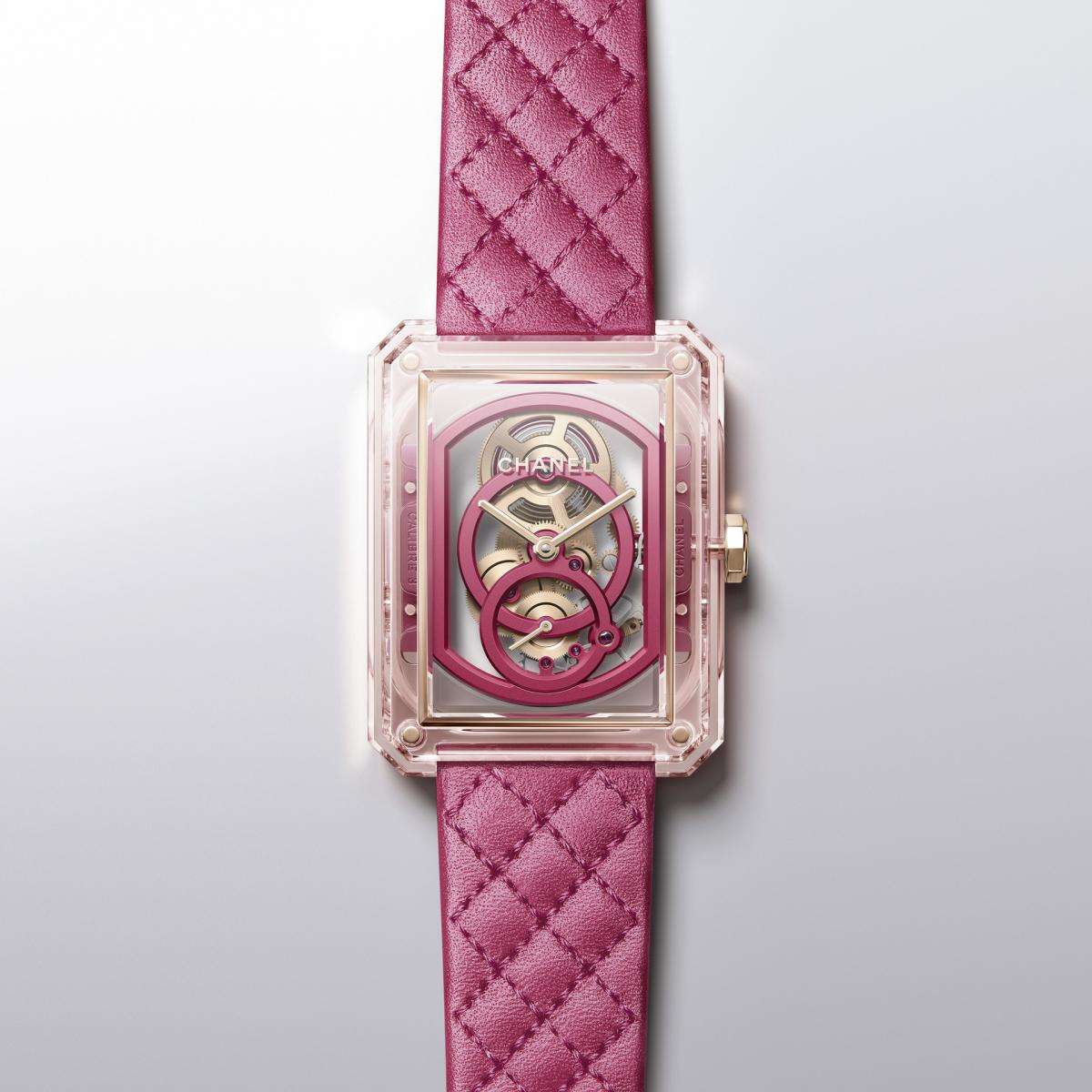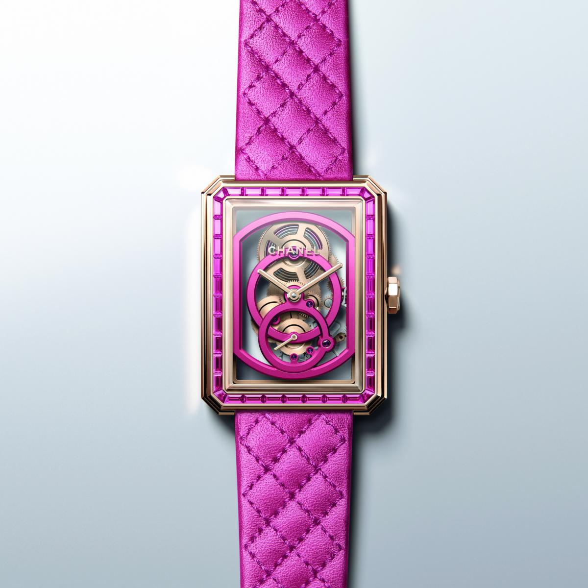最後一章節的《Pink Edition》展現了由裡至外的「粉紅」。在香奈兒女士的一生中,粉紅色一直在她的系列作品中扮演舉足輕重的地位。對品牌而言,粉紅色不再只是稚氣或可愛的意涵,而是透過多樣色階變化來展現自我個性與主權的象徵。香奈兒腕錶創意工作室將此精緻色彩與香奈兒標誌性的 Beige 米色金完美揉合,重新詮釋 J12 和 Boy·Friend 腕錶,構思出四款獨特設計。為了呈現從淺粉色到莓果色的極致色澤,香奈兒腕錶創意工作室號召品牌各領域的傑出工藝專家,包括:不可或缺的製錶師,開發絕美粉紅藍寶石水晶的工程師、蒐羅並配對天然粉紅藍寶石的寶石專家,以及為皮革錶帶創作出菱格紋圖案的皮革工藝師等,皆做出重要貢獻。
