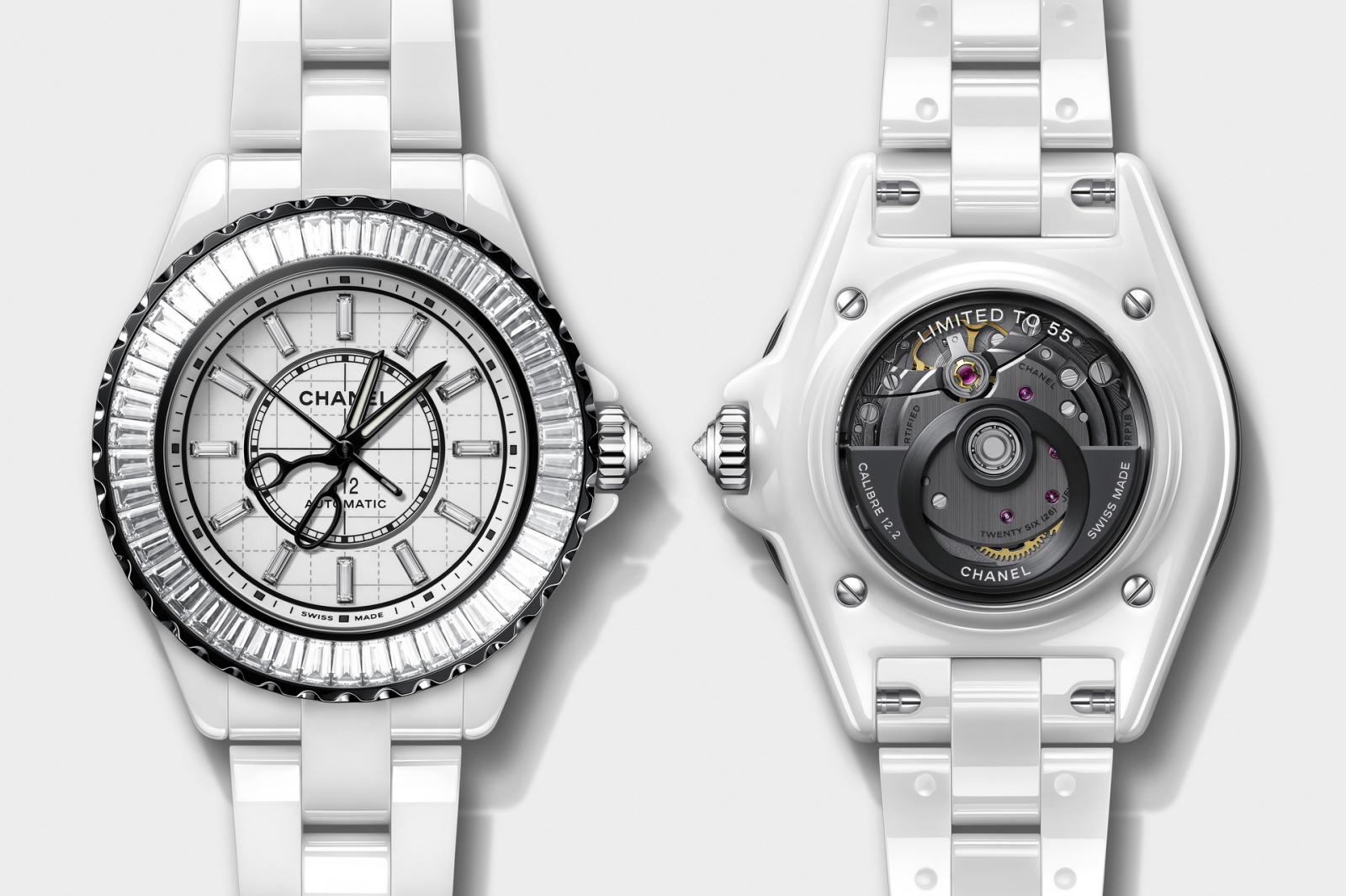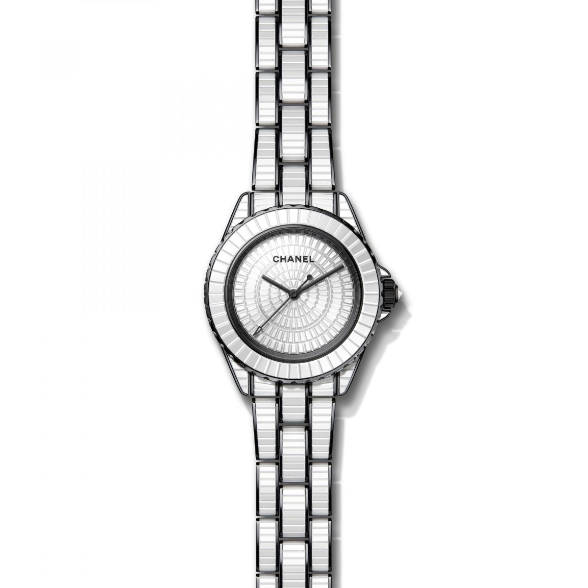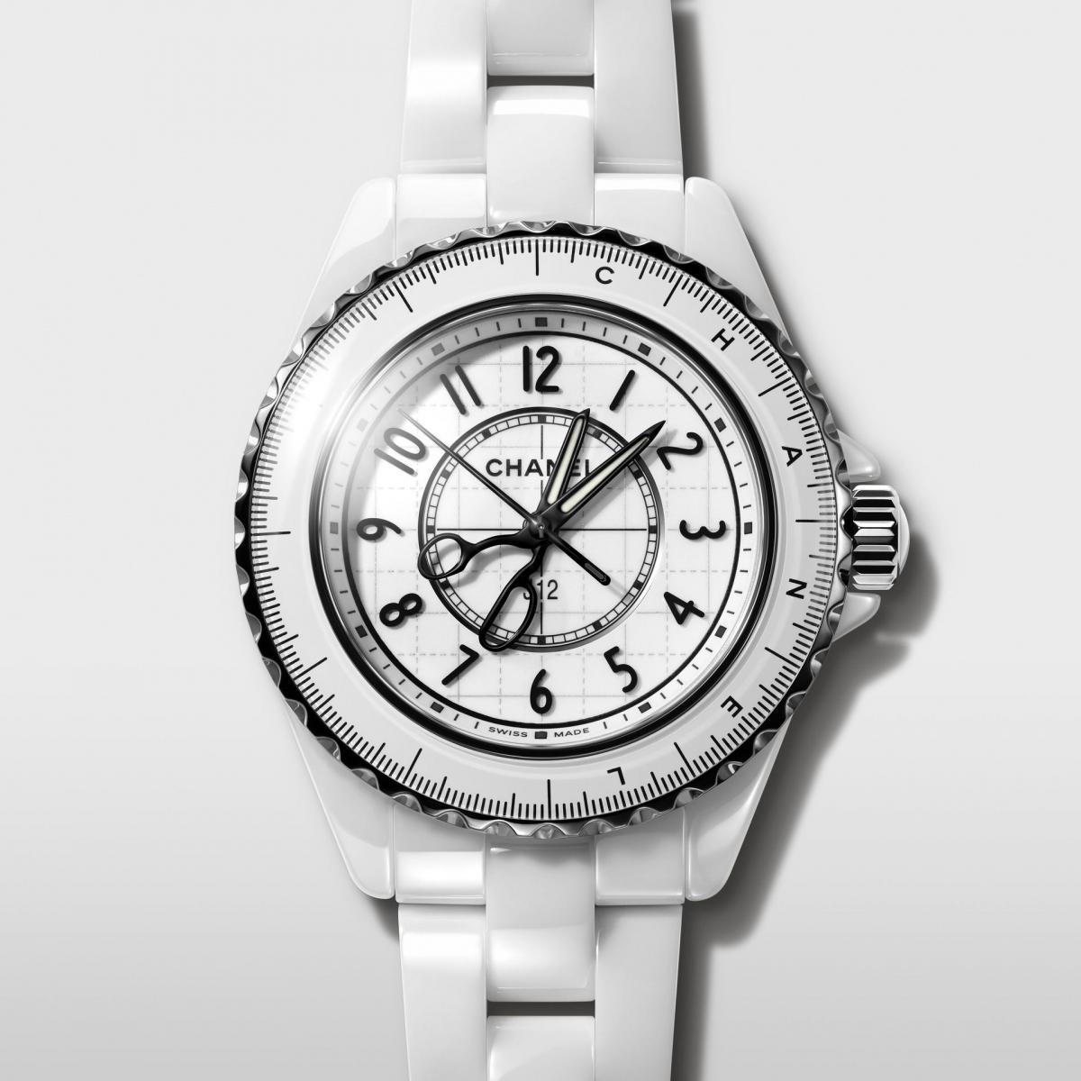 另一款33毫米錶徑的 J12 Couture 系列腕錶,同樣取材自巴黎康朋街工作坊的裁縫工具符碼,以胚布、縫紉針、裁縫剪刀及捲尺,訴說著香奈兒高級訂製服的故事。錶盤上隱約可見裁縫師用來製作縫紉紙樣的方格紙,並以裁縫剪刀取代了傳統腕錶指針,而秒針則化身成一根訂製服縫紉針,體現品牌的訂製服傳統。錶盤上的剪刀與縫紉針隨著時間推移而轉動,就彷彿裁縫師正在以巧手裁剪及縫紉,一針一線都穿梭於時間這襲華服之上。