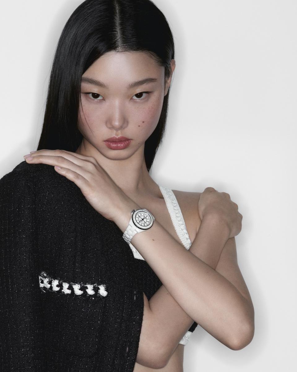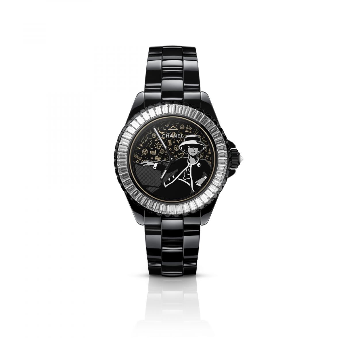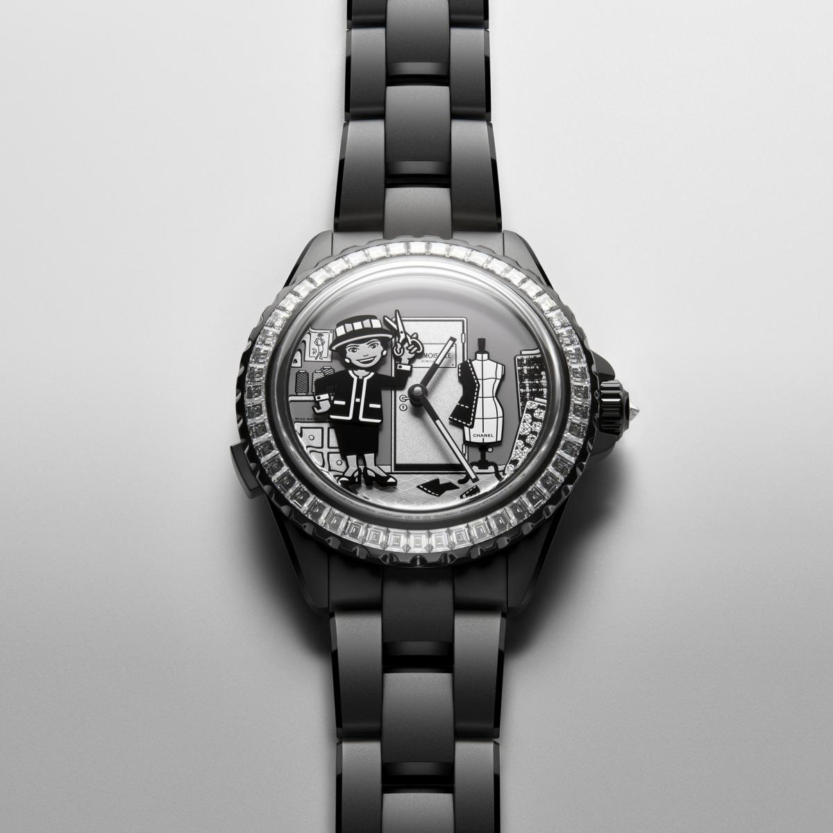 Mademoiselle J12 Couture 腕錶的靈感來自於香奈兒女士在「康朋街31號」自家寓所內所拍攝的一張照片,照片中香奈兒女士身著緄邊套裝優雅地坐在沙發上,並搭配標誌性的珍珠長項鍊,配戴山茶花及招牌帽子,姿態輕鬆地凝望遠方。