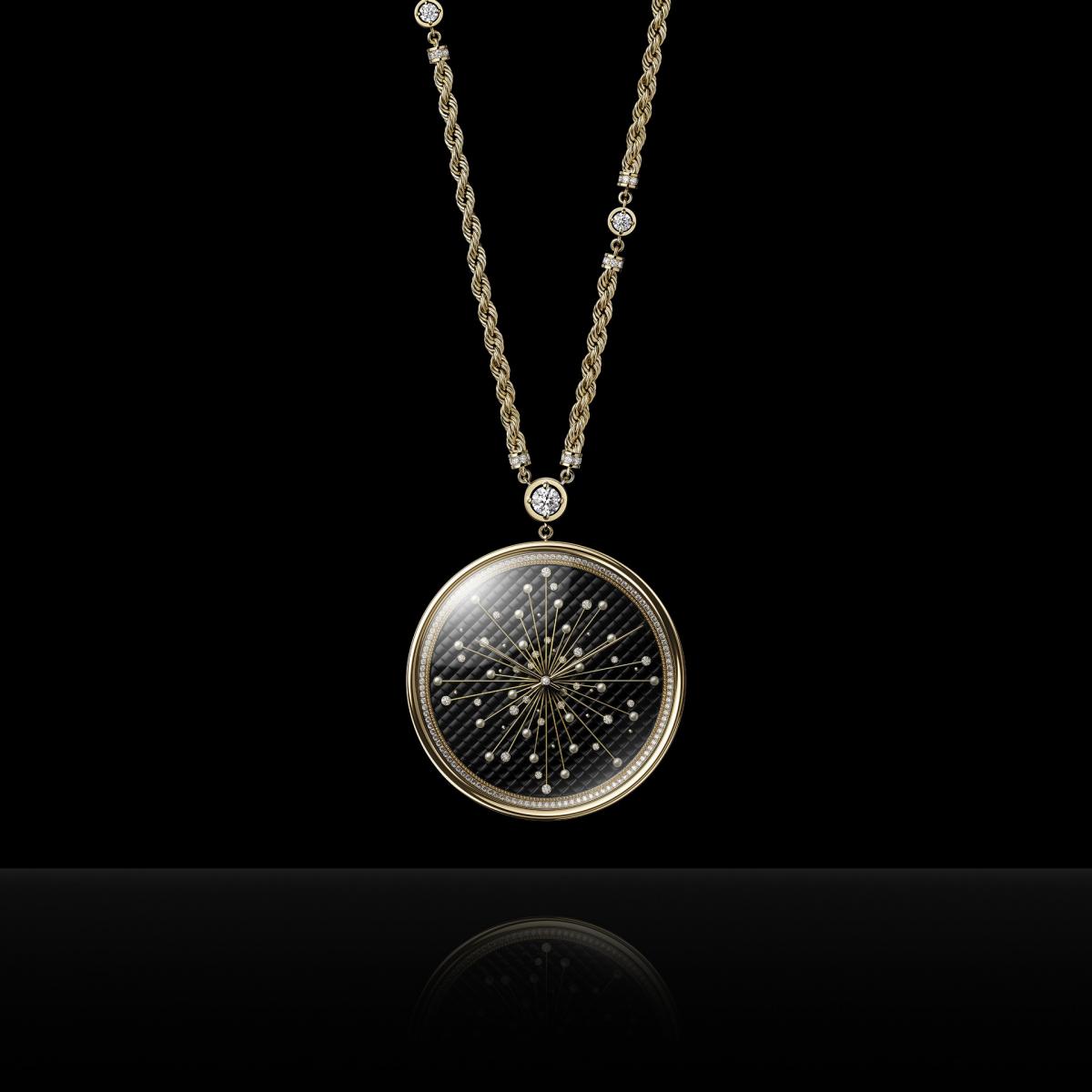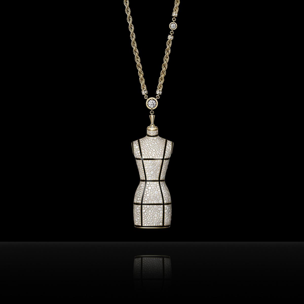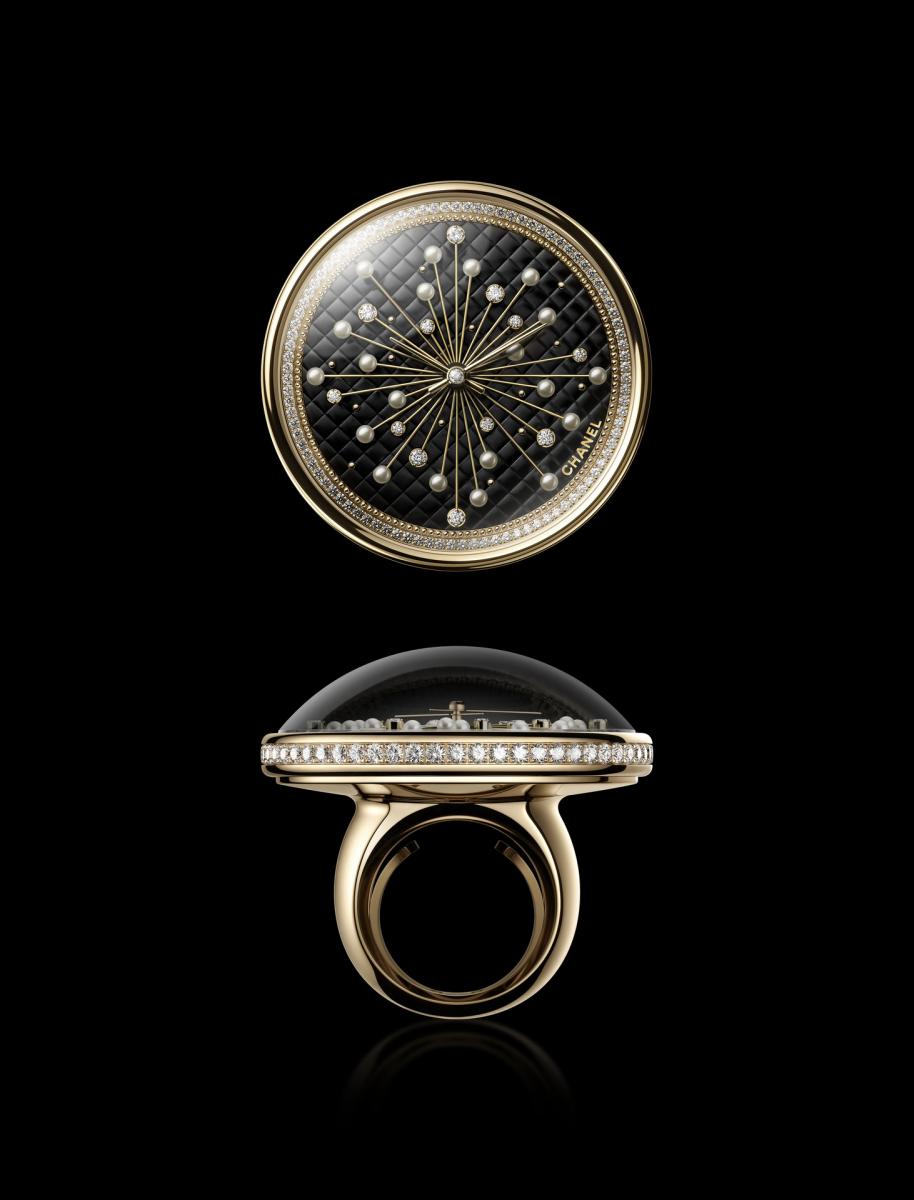 用以製作高級訂製服的「人檯」,是香奈兒今年極為重要的元素。因此,香奈兒腕錶創意工作室總監 Arnaud Chataingt,以香奈兒女士的微型世界作為發想,將時鐘與音樂盒融合,攜手工藝精湛的工匠,精心創造出此款 Couture Workshop 音樂座鐘。為了重現康朋街工作坊內生動活力的氛圍,此款音樂座鐘以 Al Bowlly 的《My Woman》作為旋律,這是香奈兒女士喜歡哼唱的歌曲。座鐘的玻璃穹頂內,有著鑽石墜飾的水晶燈、以軟墊沙發為靈感的底座,及各種金色裝飾,這些細節都令人聯想起香奈兒女士的寓所。從微型水晶燈的鑽石外殼墜飾,到以手工精細打造再進行調校的音樂裝置,在在都讓這款音樂座鐘盡顯卓越的技術實力與深厚的美學底蘊。