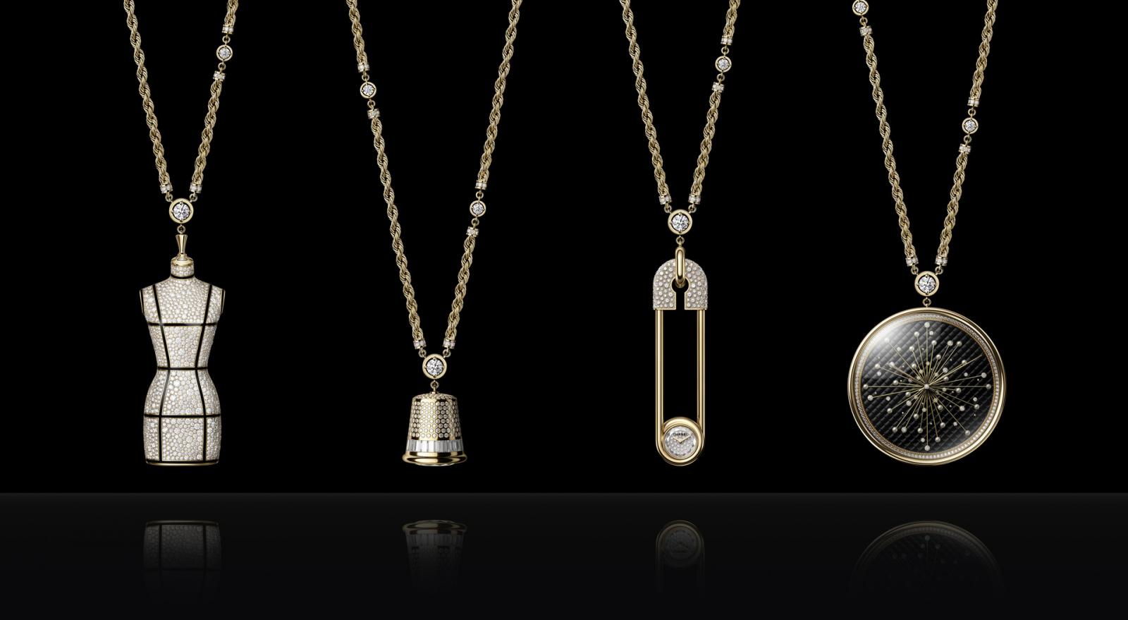 除了將經典的 J12 系列錶款融入創新元素外,《Couture O’Clock》篇章亦展示出一系列「既是腕錶亦是珠寶」的嶄新藝品,將香奈兒女士的縫紉工具,經過具象的符碼轉換,設計成多樣化的長項鍊錶、手鐲與戒指腕錶。 Couture Tools 系列中包含了完美重現高級訂製服人檯的 Couture 半身像長項鍊錶,以及 Couture 針頂長項鍊錶、Couture 別針長項鍊錶、Couture 線軸手鐲腕錶。除此之外,也能見到以針墊為雛型設計的 Mademoiselle Privé Pincushion Couture 長項鍊錶、手鐲腕錶、戒指錶。香奈兒腕錶創意工作室將這些再日常不過的「裁縫」元素,轉換至奢華製錶領域,化身令人驚艷的卓越錶款設計。