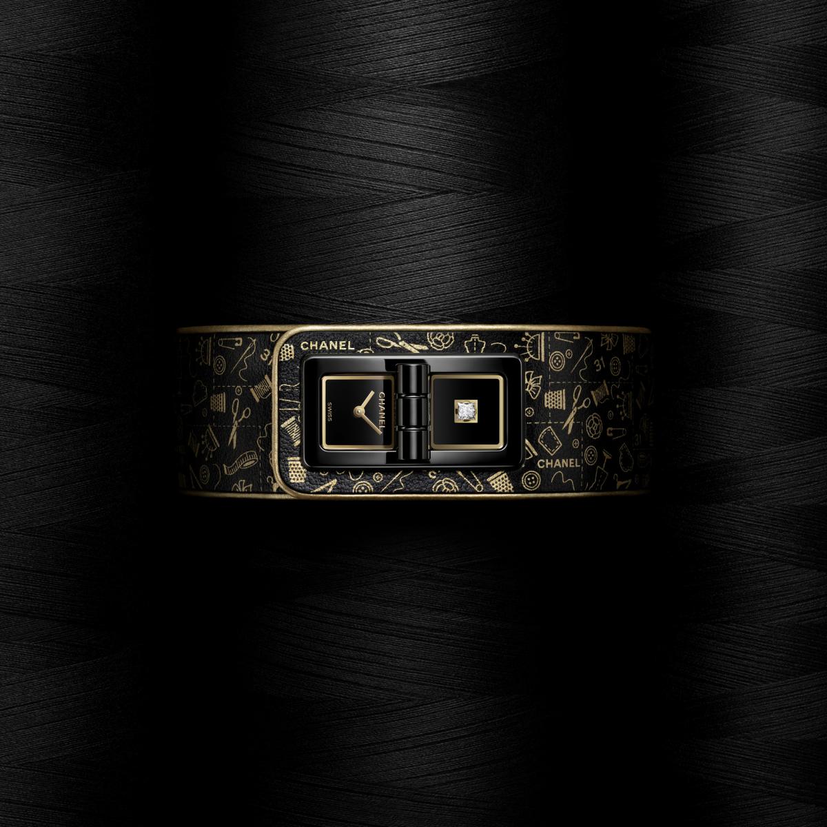 既然是以工坊中的裁縫工具為靈感啟發,那怎麼能少了香奈兒訂製服工坊中隨處可見的「鈕扣」呢?鈕扣在香奈兒女士的創作中始終為重要元素,因為鈕扣曾是她作品中唯一的裝飾品。因此,腕錶創意工作室重新審視 Mademoiselle Privé Bouton 系列的標誌性雙鍊設計,改以粗曠鍊條環繞錶殼,並加入香奈兒女士輪廓肖像的鈕扣造型,以18K黃金及縞瑪瑙,打造出全新的 Mademoiselle Privé Bouton Gabrielle 腕錶。