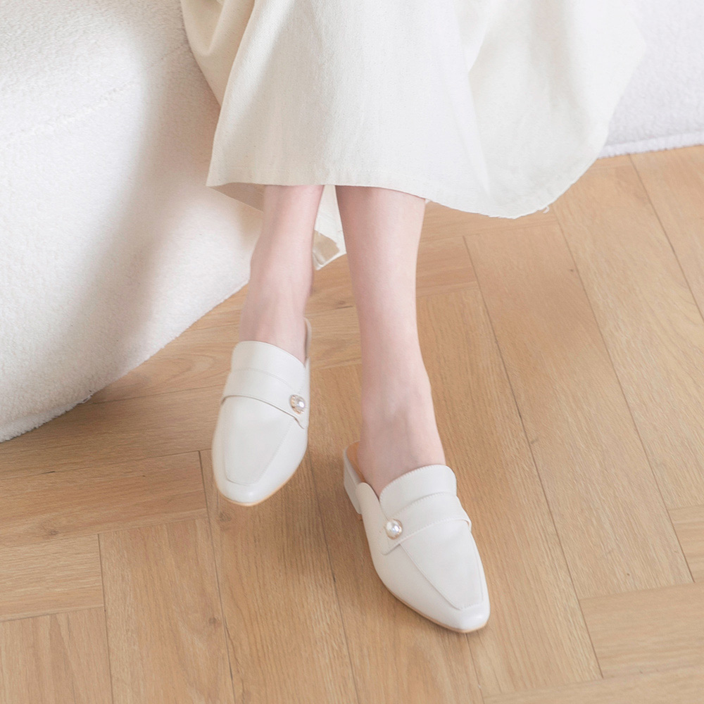 穆勒鞋推薦3.amai 真皮簡約珍珠小方頭粗跟穆勒鞋