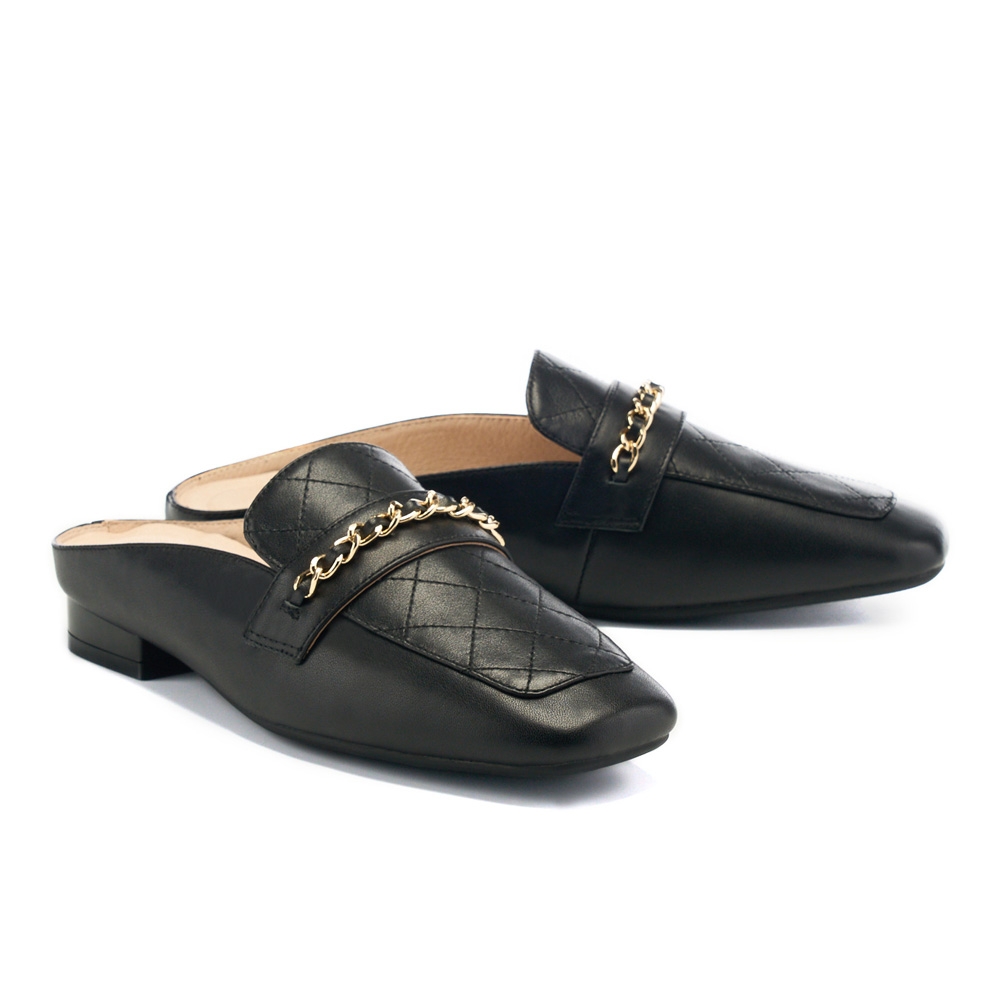 MISS 21 MODA MODAY全真皮方頭低跟穆勒鞋,特色的經典菱格造型、方頭鞋設計,給人一種專業、時尚的感覺。黑色半拖鞋,經典、極簡設計,更容易與衣櫥裡的衣服做搭配。無論是穿上襯衫、西裝褲或是牛仔褲,都能展現出不同風格的優雅魅力。低跟設計能讓你穿著舒適,又不失高雅。
