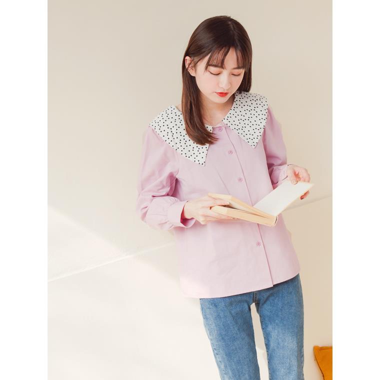 這款娃娃翻領拋袖襯衫採用高棉質布料,吸濕透氣,天氣溼熱也不會造成肌膚不適,搭配著小愛心的印花,不顯俗氣但又增添一絲浪漫感。袖子採用立體小拋袖剪裁,可以稍微的遮蔽掰掰肉,直接跟掰掰肉說掰掰!