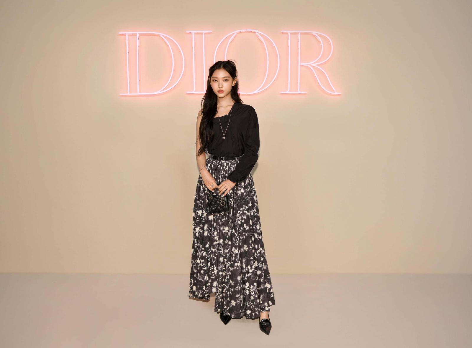 來到大秀現場,這回Haerin將一頭長髮放下,換上相對正式的印花百摺長裙和尖頭高跟鞋,其中造型亮點放在上身黑色襯衫,以不對稱的斜肩剪裁露出鎖骨和右手手臂,並搭配一條星星造型項鍊平衡造型成熟感,也帶出她文靜優雅的一面。而對於經典籐格紋情有獨鍾的Haerin,在看秀時選擇了經典款式Lady Dior,超迷你的微型尺寸和飄逸長裙形成對比,也讓視覺層次不會過於沉重。(商品售價:NTD 120,000元)