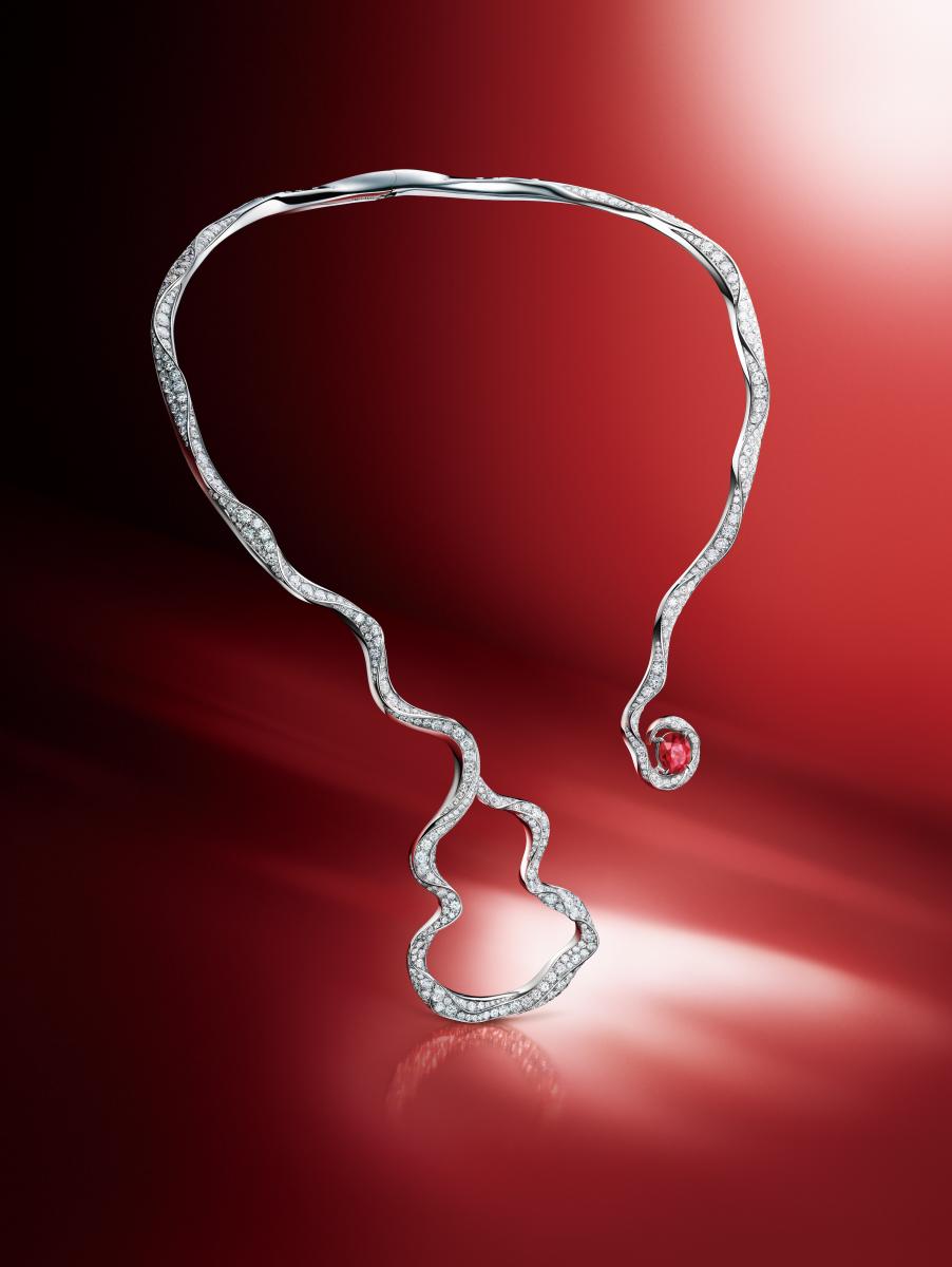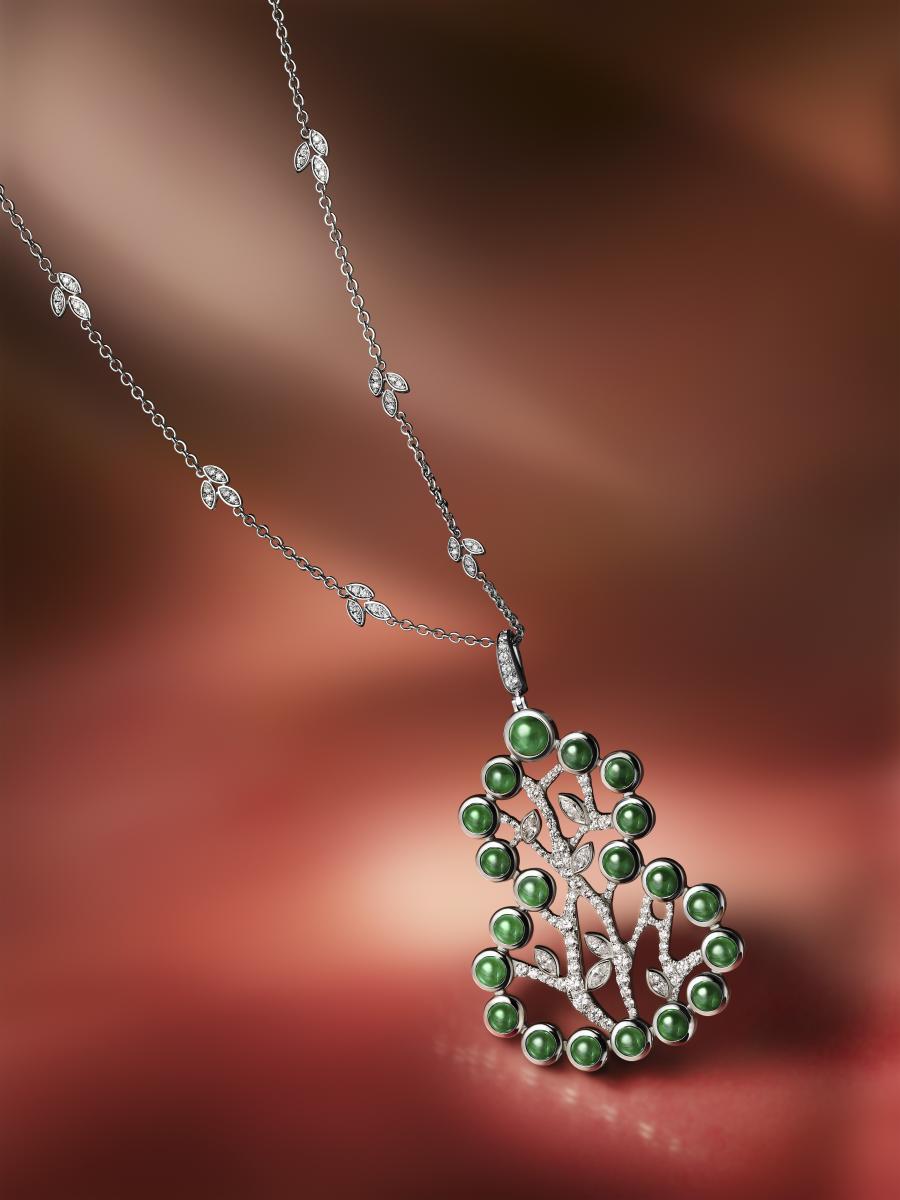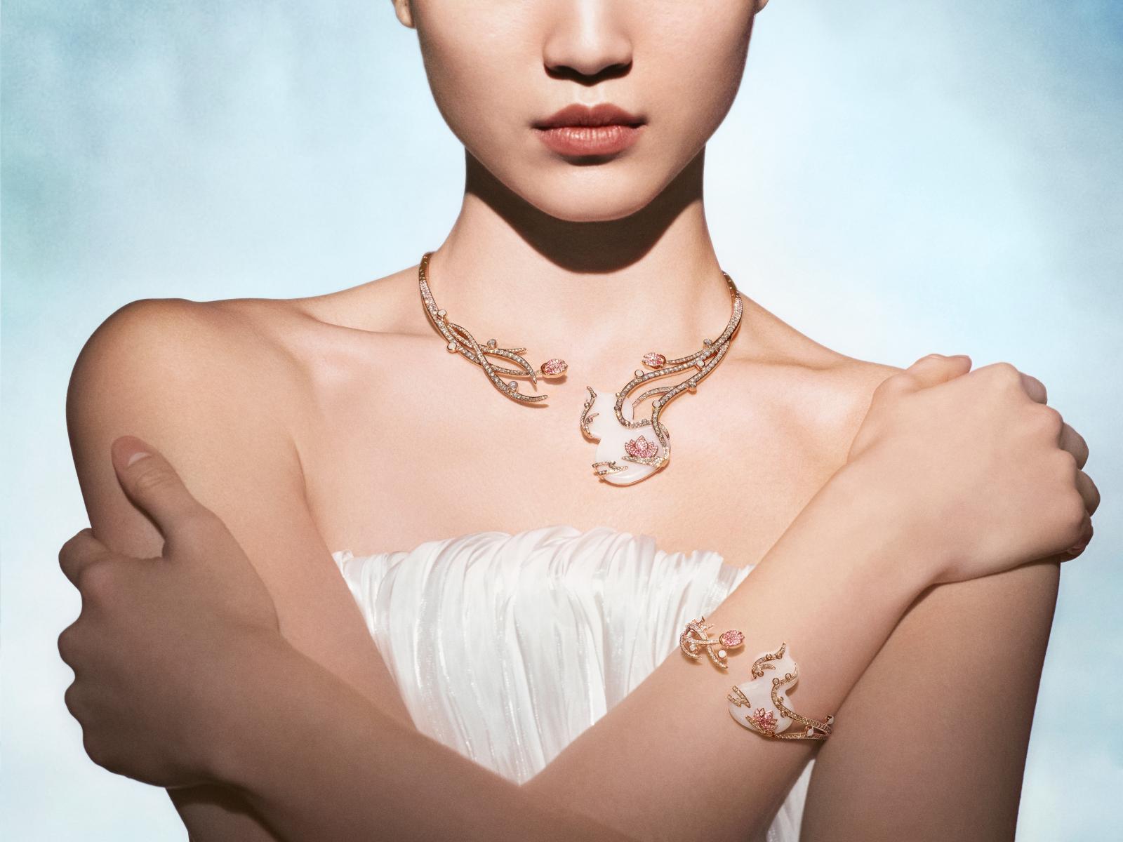 周敦頤的〈愛蓮說〉曾形容蓮花「出淤泥而不染」的美好,因此蓮花對於中華文化來說,帶有著高尚與純潔的符號意涵。「Wulu Lotus Pond 高級珠寶系列」勾勒出蓮花及蓮葉流光幻動的模樣,璀璨的白金鑽石、紫羅蘭及白玉翡翠,彷彿蓮花、蓮葉、露珠與月光相互映射,營造出光影之間亦真亦幻的詩意效果。此系列包含項鍊、手鐲和耳環,當它們輕柔地環繞、垂墜,肌膚也宛如被古典的風景輕覆,見證夢境與現實的交融。