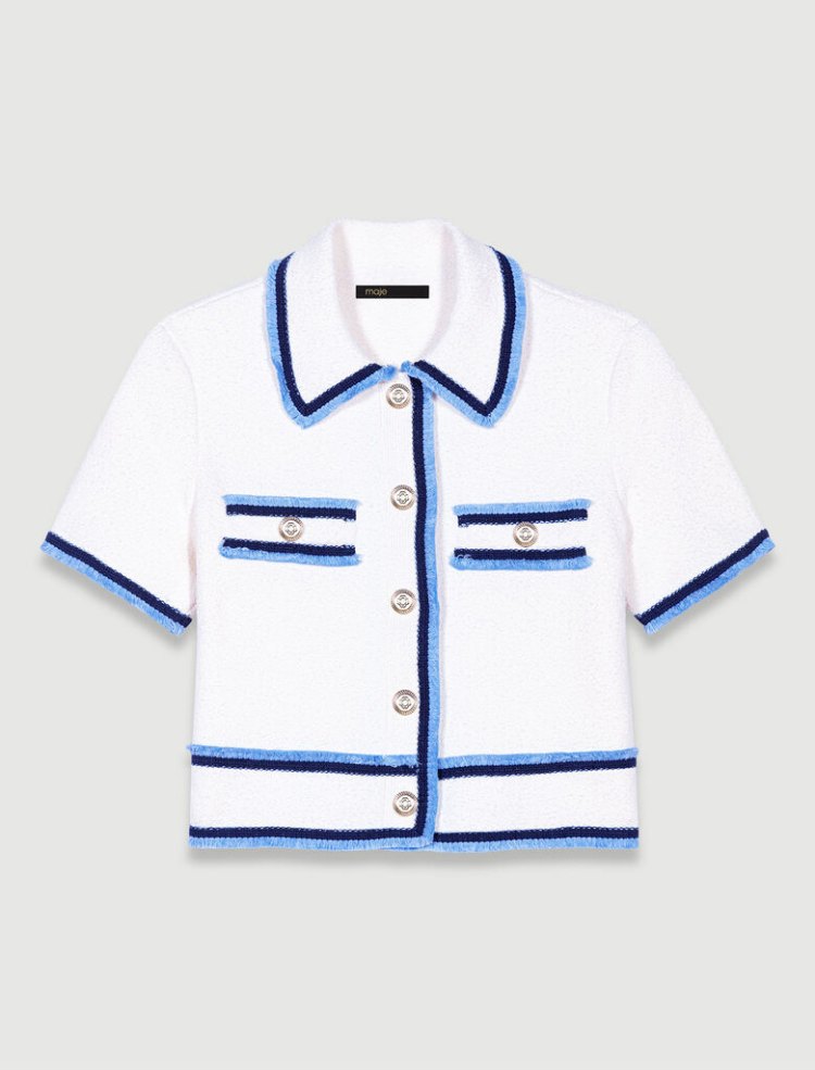 想要展現千金感的話,這件藍色滾邊的短版針織上衣請收進衣櫃裡,充滿細節又好搭配的特性,簡單一件牛仔褲穿搭就很時髦。(商品售價:NTD9,190)