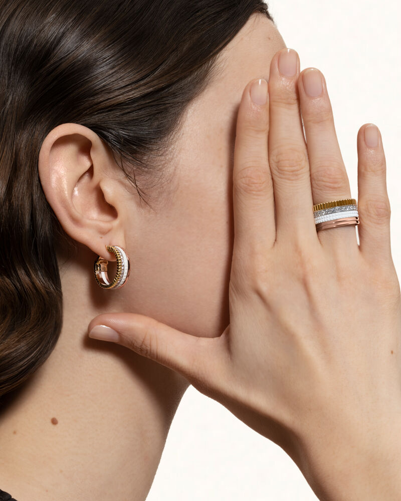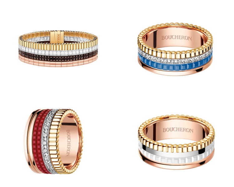 Boucheron Quatre 系列的「四環設計」靈感分別汲取自富含品牌意義的「4大經典元素」,從第一圈的「羅緞直線刻紋」(Grosgrain)開始,到第二圈的「鑽石圈」(Diamond Line)設計,以及第三圈的「巴黎飾紋」(Clou de Paris)與第四圈的「雙圈同心圓」(Double Godron),每一圈都有其意義,亦各自表述著寶詩龍品牌的歷史痕跡與典故。