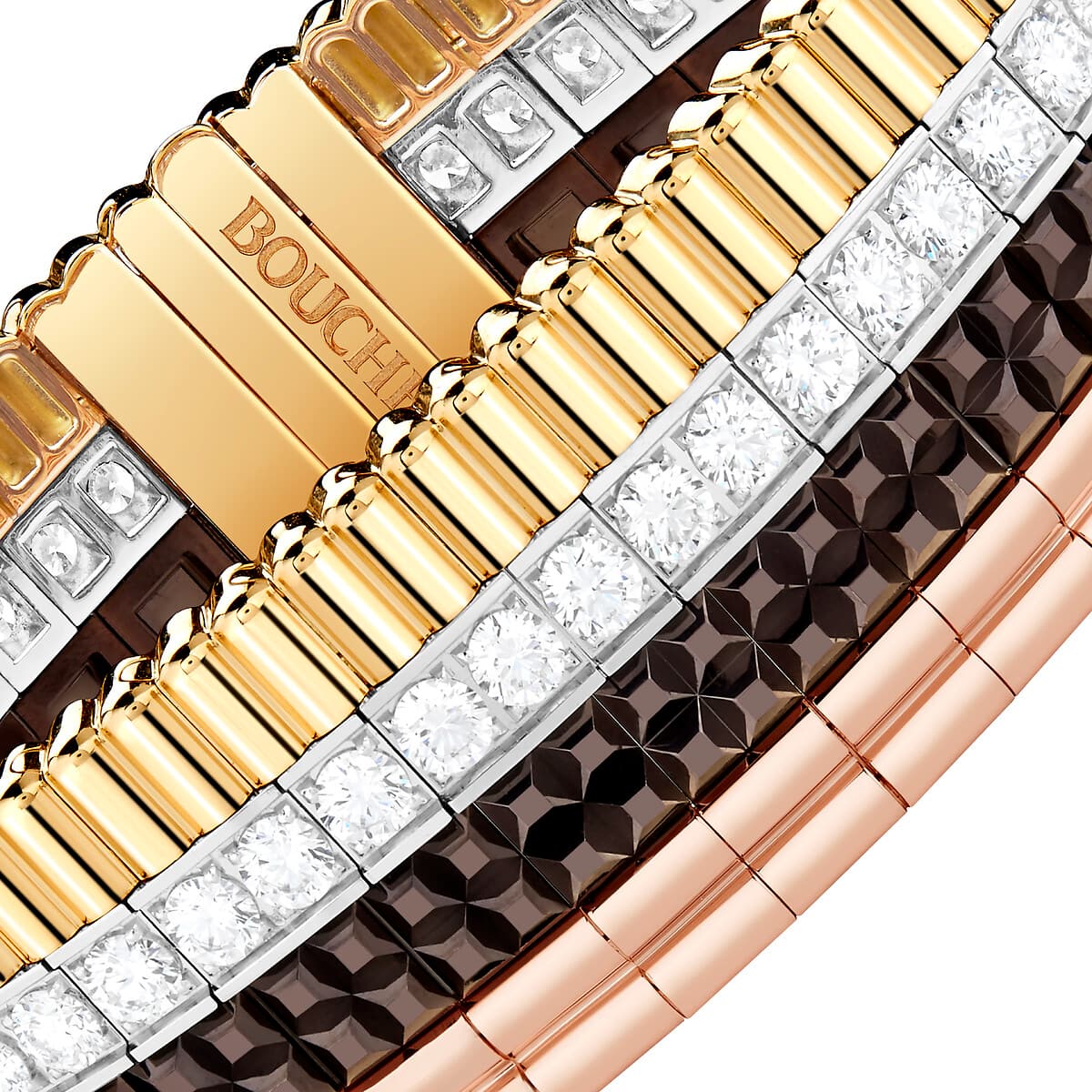 Boucheron Quatre 系列擁有多樣化的色彩選擇,包括:經典配色的 Quatre Classique 系列;藍色陶瓷的 Quatre Blue Edition 系列;白色陶瓷的 Quatre White 系列;紅色陶瓷的 Quatre Red 系列;將經典配色中的玫瑰金「雙圈同心圓」置換為18K白金的 Quatre Black 系列;全部貴金屬及陶瓷部份皆置換為18K黃金的 Quatre Radiant 系列;全部貴金屬皆置換為18K白金及白色陶瓷的 Quatre Double White 系列。