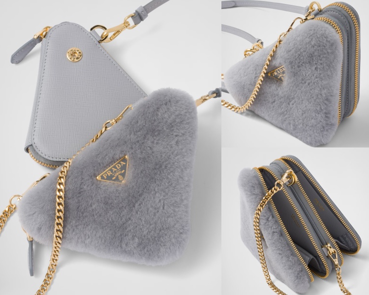 三角形一直都是 Prada 的標誌性造型,這款 Saffiano 皮革迷你化妝袋,將經典元素以立體方式重新演繹。少見的矢車菊藍(Cornflower Blue)皮革鋪滿澎鬆柔軟羊毛,搭配上1913年首次面世的經典搪瓷金屬三角標誌及金色鍊帶,讓這款包吸睛度滿分,不論四季都適合搭配!(商品售價 NT$52,000元)