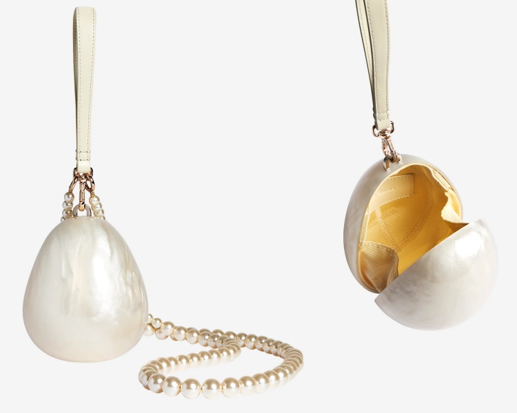 若提到 Simone Rocha 最令人印象深刻的手袋,絕對不會忘記這款 Micro Pearl Egg Bag!迷你的白色蛋形設計,不僅前衛嶄新,同時具有浪漫少女情懷,完全將手袋的意義提升至另一個層次,展現出迷你小包最重要的並非裝載功能,而是搭配及造型。珠光效果的橢圓包身,打造出引人注目的外觀,搭配上可拆卸斜的珍珠背帶與皮革提把,怎麼拿都夢幻到不行。(商品售價約 NT$17,500元)