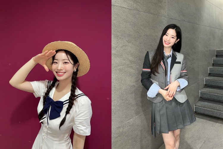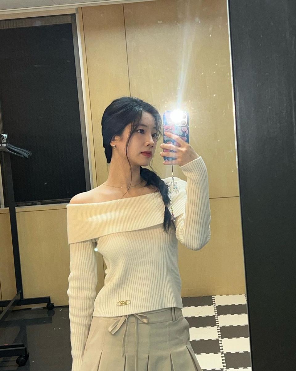 多賢的私服造型相當偏愛裙裝,其中以學院感十足的「百褶裙」單品最為常見!迷你裙的膝上長度、打褶細節讓造型層次輕盈又活潑,腰間的蝴蝶結綁帶裝飾是少女心擔當。特別值得一提的是,多賢在上身選擇了平口針織衫作為亮點,露出肩頸曲線展現小小性感,溫柔米色系搭配蓬鬆低馬尾編髮,金色的細項鍊和MK標識則是畫龍點睛,巧妙示範「大人系甜美」風格,也讓整體造型不過於孩子氣。
