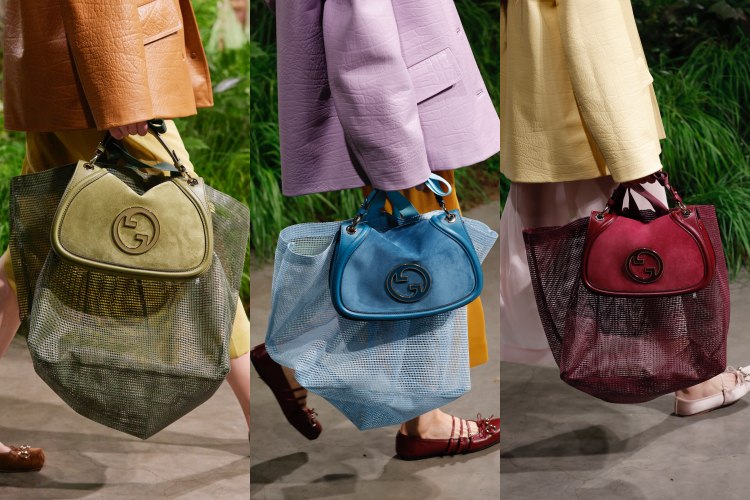 從疊掛小包再到滿滿吊飾,時裝迷對於包包造型總是很有想法,古馳這回直接以Gucci Blondie、購物袋「1+1」的搭配方式走上伸展台,一個是象徵珍稀性的精緻皮革包款、一個則是實用主義至上的亞麻網袋,任誰都不會料想到兩者同框竟然毫無違和,購物袋的尼龍織帶也以休閒風格巧妙平衡,似乎能想像提著Gucci Blondie去沙灘的畫面了!