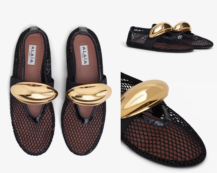 說到「娃娃鞋」怎能忘記來自法國的時尚品牌 Alaïa?尤其是它經典的「漁網芭蕾平底鞋」,絕對是時尚圈人士「人腳一雙」的必備款!標誌性的網眼設計,以及皮革繫帶上閃耀的橢圓黃銅金屬裝飾,吸睛程度百分百,前衛時髦的你必須擁有!(商品售價約 NT$ 43,600元)