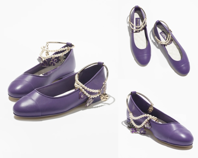 誰說「娃娃鞋」只能搭配皮革繫帶?這雙 Chanel 春夏新款的黛紫色芭蕾舞鞋,將皮革繫帶以銀色金屬環取代,裝飾上可愛吊墜,包含夢幻的紫色愛心、四葉幸運草、香奈兒「雙C」標誌、圓形禮帽、金色鑽飾山茶花以及雙排人造珍珠,一上腳盡是浪漫風華!(商品售價 NT$ 72,800元)