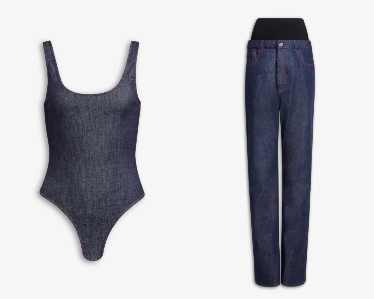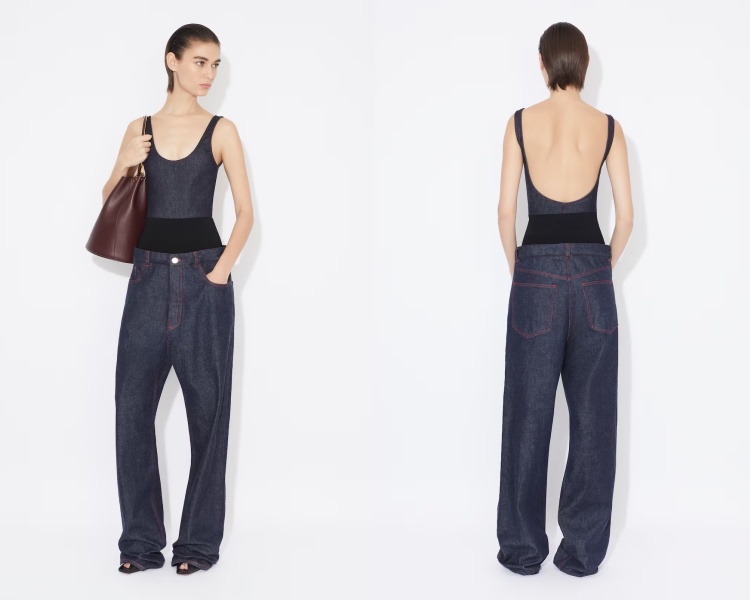 法國品牌 Alaïa 永遠能為女人增添韻味!這套牛仔裝扮自然呈現出簡約俐落的優雅美感,露背造型的丹寧連身衣前衛又性感,搭配上這條縫有「針織高腰褲頭」的特殊設計牛仔褲,及原色丹寧面料上的「紅色縫線」細節,穿上身直接成為最摩登的都會儷人。(商品售價:連身衣 NT$ 29,700元/長褲 NT$ 47,000元)