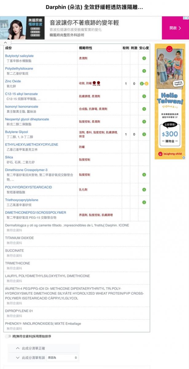 source: DARPHIN全效舒緩清透防護隔離霜SPF50成份明細,來源COSDNA網站