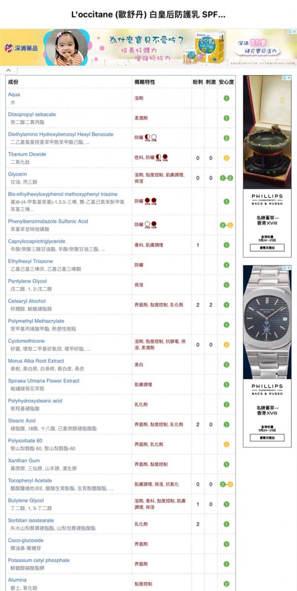 source: L'OCCITANE歐舒丹歐舒丹白皇后防護乳SPF50成份明細,來源COSDNA網站