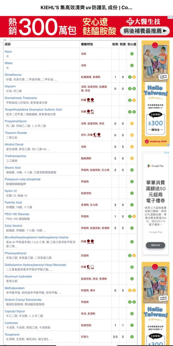 source: Kiehl’s集高效清爽UV防護乳SPF50/PA++++成份明細,來源COSDNA網站