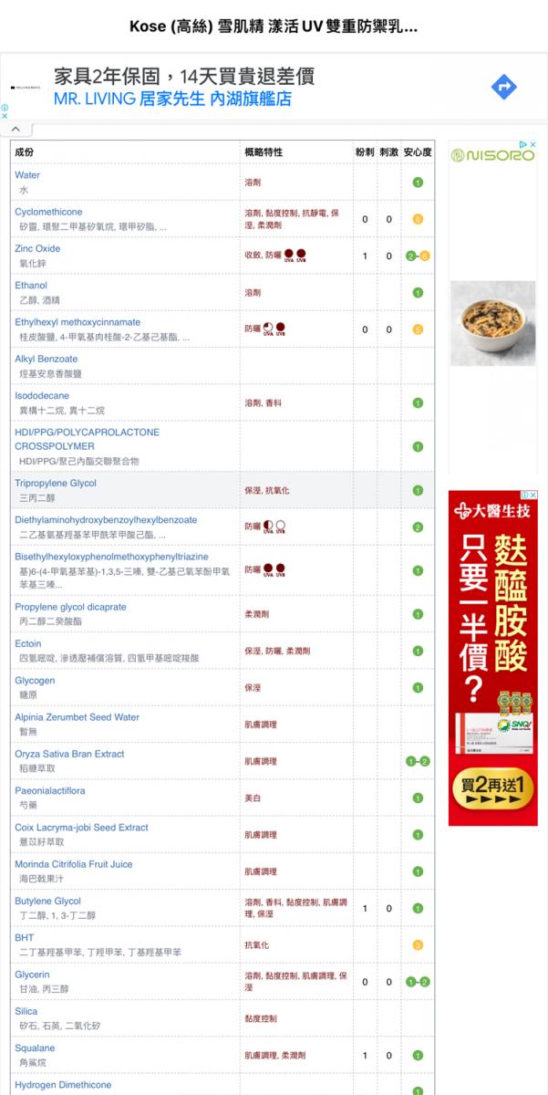 source: KOSÉ SEKKISEI雪肌精漾活UV全效防禦凝膠SPF50+/PA++++成份明細,來源COSDNA網站
