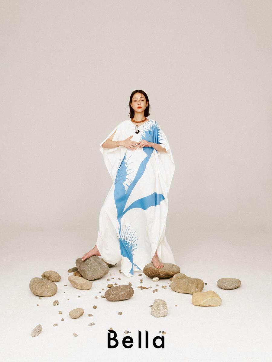 藍色潑墨印花罩、木質頸鍊,both by Ferragamo;玫瑰金戒指、玫瑰金戒指、玫瑰金手環,all by Chaumet。