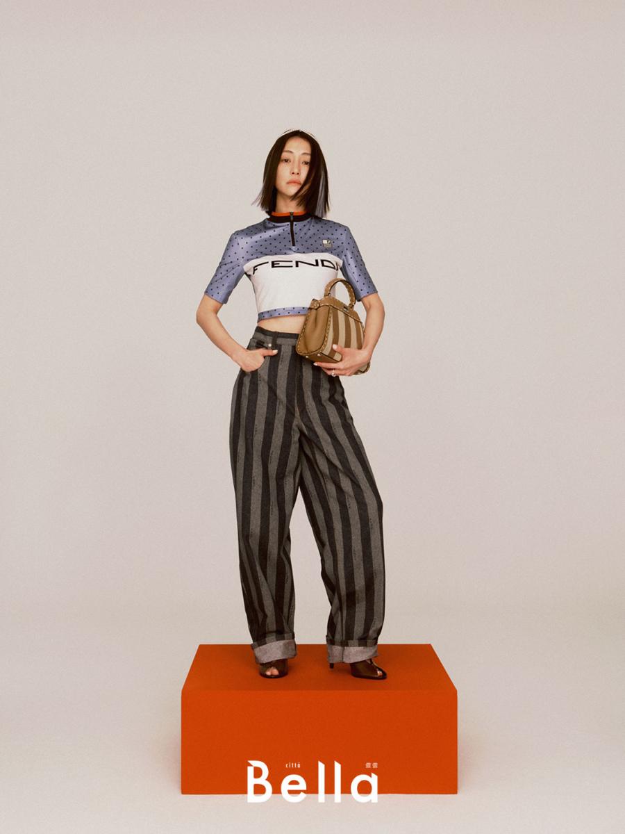 短版自行車衣造型上衣、條紋寬褲、皮革高跟鞋、條紋皮革手提包、咖啡色高跟鞋,all by Fendi;白金鑲嵌珍珠以及明亮式切割鑽石頭飾,Chaumet。