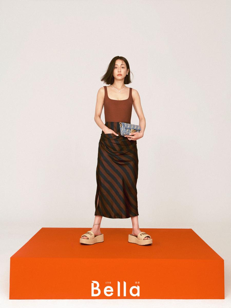 咖啡色坦克背心、條紋抓褶窄裙、編織厚底拖鞋、Logo鍊帶包,all by Fendi;鑽石項鏈、鑽石耳環,both by Chaumet。