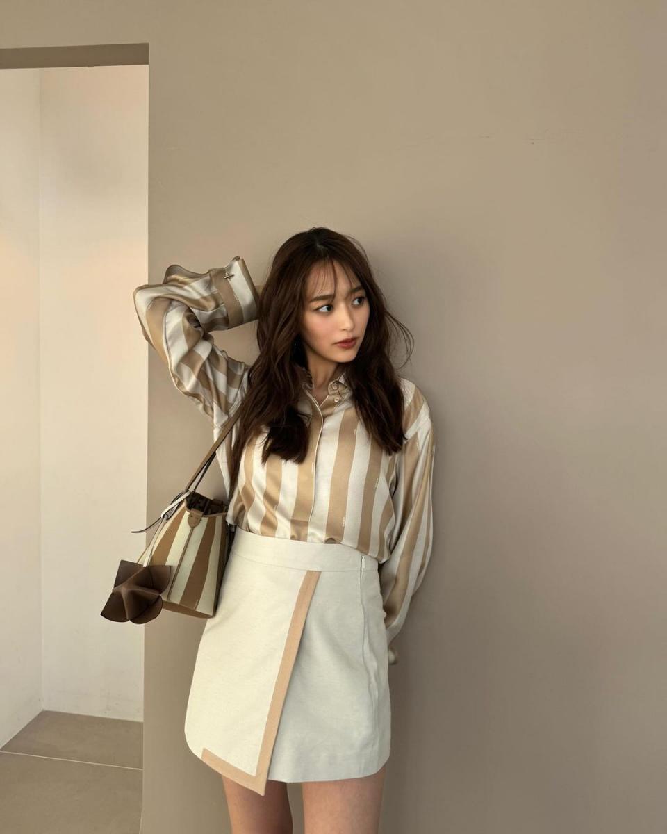 在社群上擁有159萬追蹤的近藤千尋是日雜模特熟面孔,以一雙電眼和甜美穿搭讓女孩們爭相學習,像是這套來自Fendi 2024春夏系列的條紋裙裝,在她的演繹之下就穿出不一樣的日系溫柔氣質!淺棕色Pequin條紋襯衫以真絲材質塑造出奢華休閒氣息,白色系為主的修身長裙只在裙摺上簡約點綴棕色線條,帶出簡約大氣感的同時也平衡上下身的視覺比例。此外,近藤千尋也細心在妝髮部分融入巧思,像是亞麻棕色的中長髮配上空氣瀏海,還有呼應服裝色調的紅棕色唇彩,創造出清甜可人的日系少女感,也讓整體造型看起來柔和和諧。
