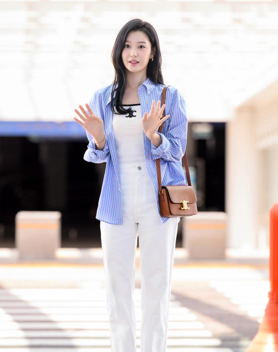 《淚之女王》掀起的「金智媛穿搭風潮」持續爆紅中!日前她穿上Celine最新2024夏季系列現身首爾仁川機場,以全白造型搭配一件藍白色直條紋襯衫,以「敞開不扣」的方式增添穿搭層次,與內搭滾邊背心相互映襯,展現率性清爽的夏日風格。不只能當作輕盈的外搭罩衫,脫下後妳也能隨手將兩隻袖子打結,直接把襯衫作為披肩搭配,而金智媛也特別選擇同樣是白色系的牛仔褲,以略帶喇叭形的廓形,創造拉長下身比例的視覺效果,再背上一款焦糖棕Celine側背包,盡顯金智媛的姣好氣質!