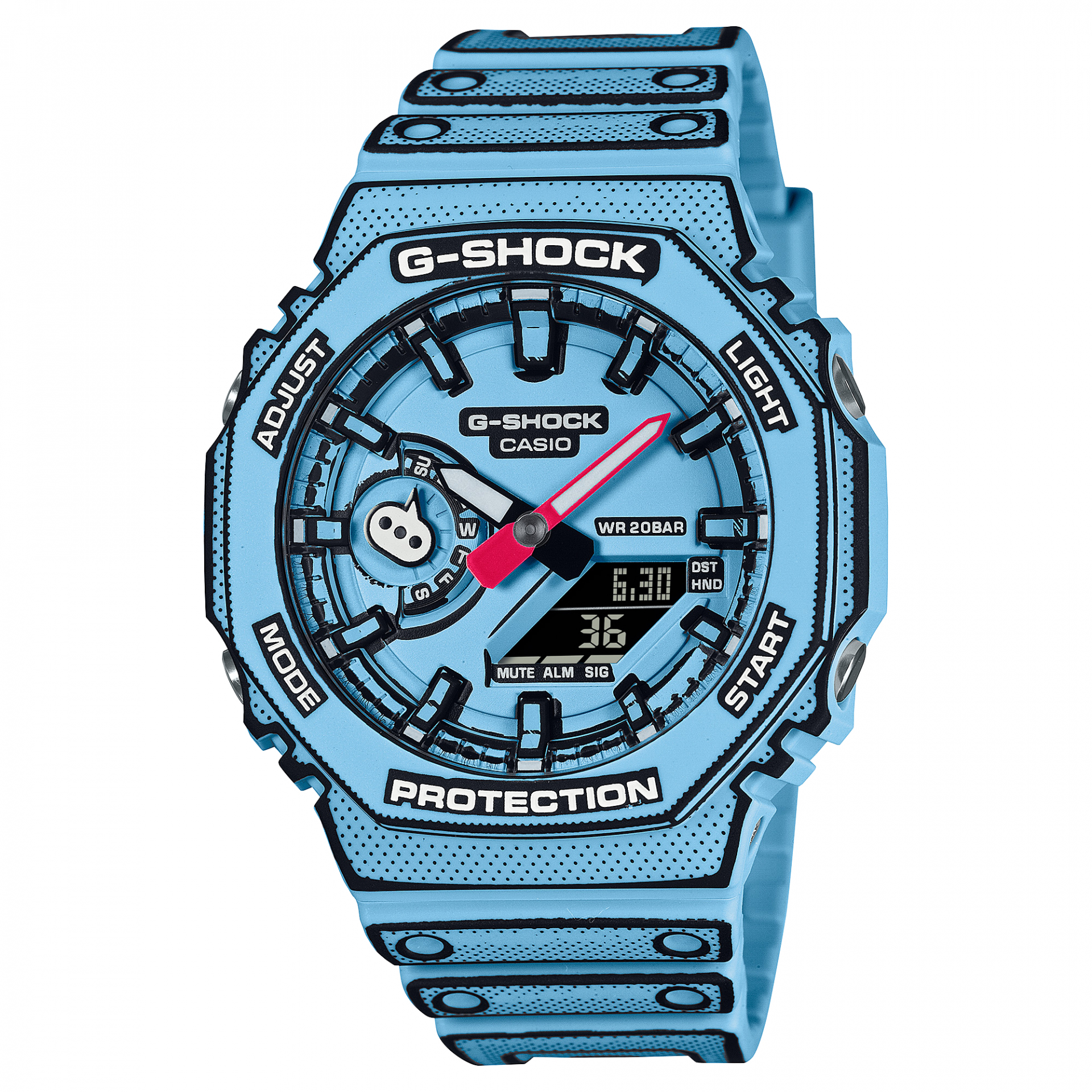 CASIO旗下G-SHOCK多年來致力於打造耐撞抗震又兼具潮流時尚的錶款,本次更是將日本文化中不可或缺的漫畫元素融入腕錶的外觀設計之中,打造出全新風格的GA-2100MNG系列,此錶款提供天空藍和經典白兩種配色。