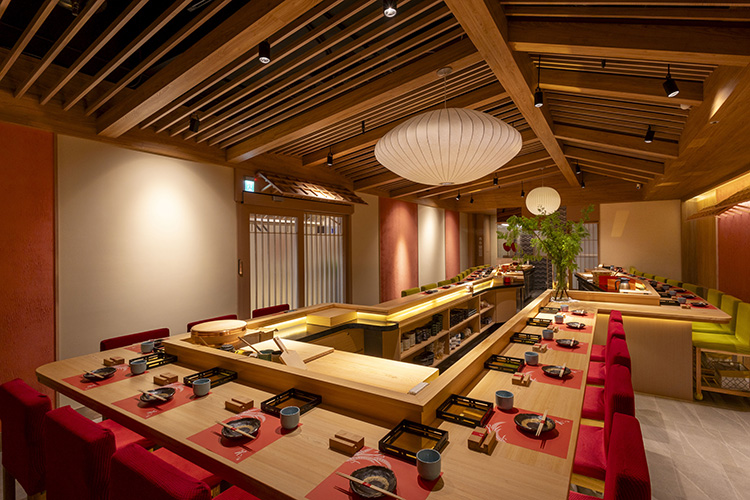 以現代現代京都風格為主題的華山店,天花板壯觀的椽樑、散發柔光的Herman Miller吊燈和大膽的京都甚三紅色土牆令人印象深刻。為凸顯空間感,用餐區設計之初即決定去包廂化,改以分段曲折的板前設計巧妙界定出座位區域分隔,直線與圓弧構建的檜木板前環繞廚師作業檯面,師傅備餐與說菜的服務流程為腳。